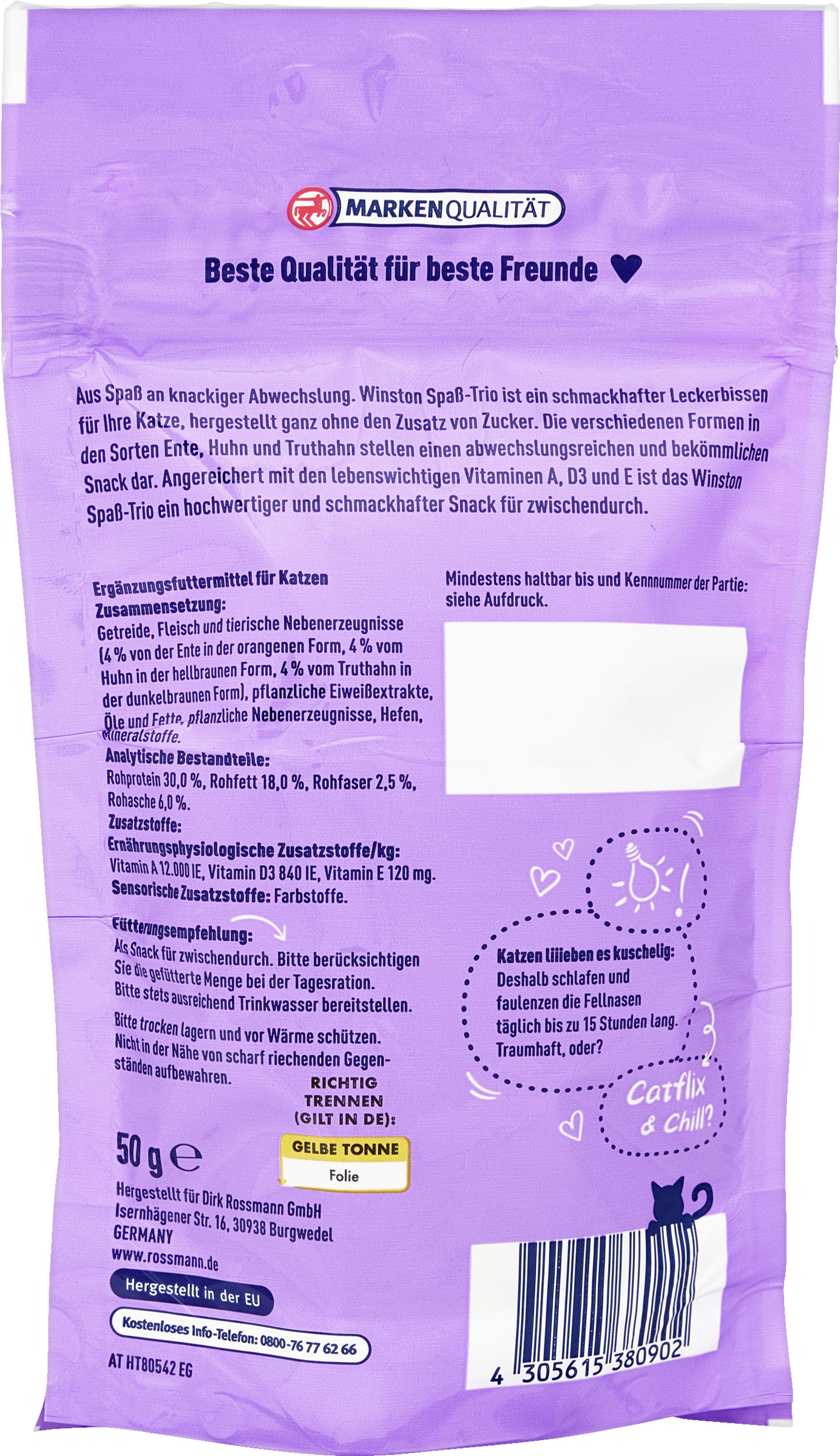 Winston Spaß-Trio er en sprød godbid til din kat. De forskellige former med sorterne and, kylling og kalkun er varierede og uimodståelige sjove snacks.