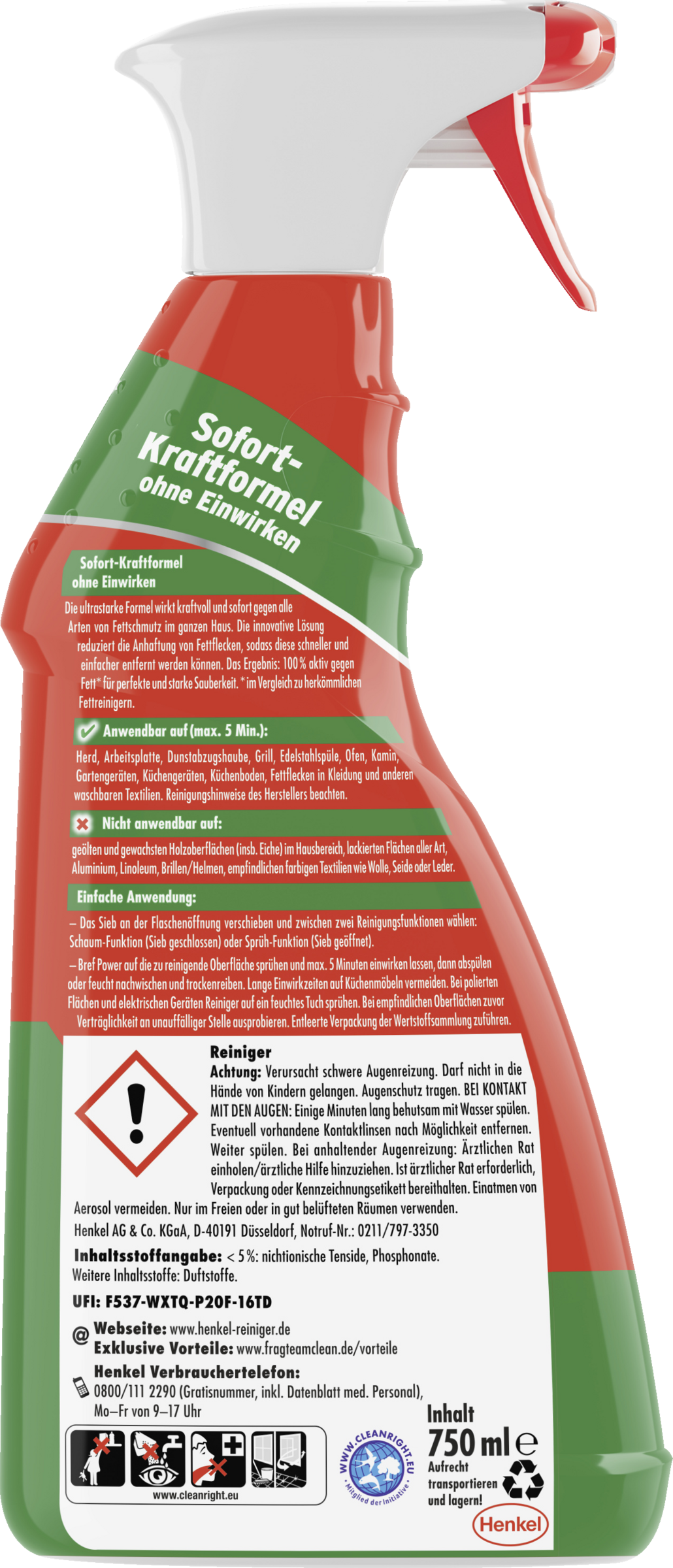 - Lad Bref Power virke på overfladen, der skal rengøres, i maks. 5 minutter, og skyl derefter, eller tør af med vand og gnid tør. Undgå lange indvirkningstider for køkkenmøbler. Spray rengøringsmiddel på en fugtig klud ved polerede overflader og elektriske apparater. Afprøv kompatibiliteten på et usynligt sted forinden ved følsomme overflader. Aflevér kun emballagen til genbrugsstationen, når den er fuldstændigt tømt for rester.