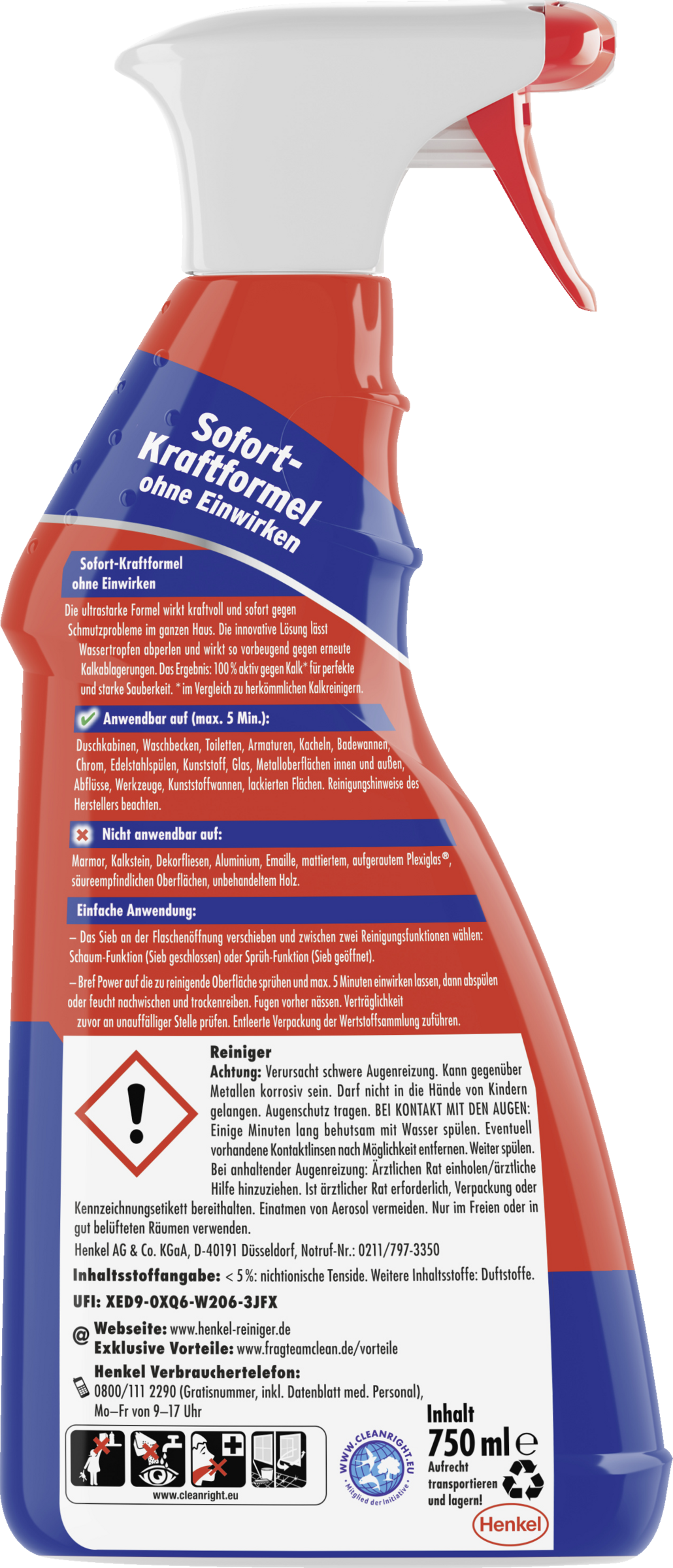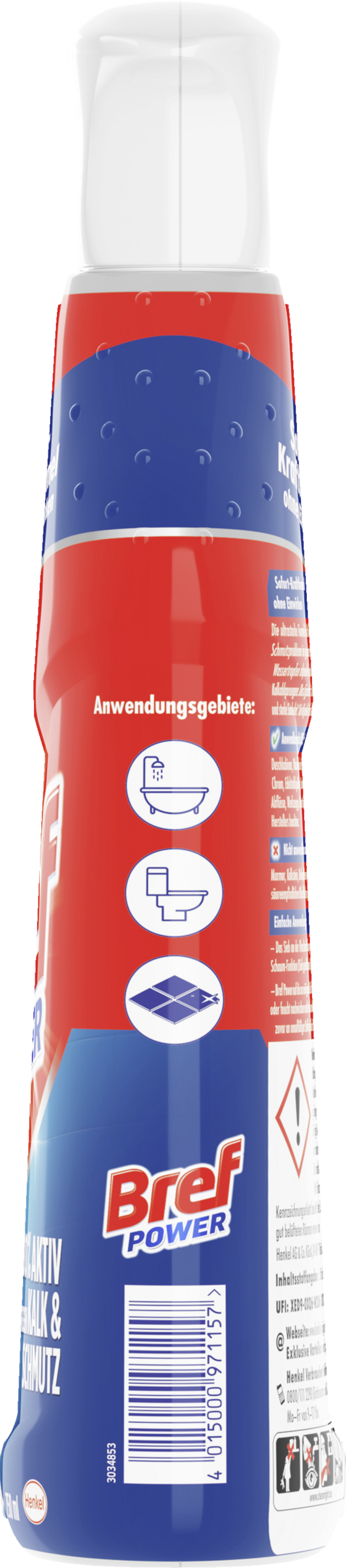Bref Power mod kalk og snavs virker med det samme mod smudsproblemer i hele huset. Den innovative formel lader vanddråber prelle af og forhindrer nye kalkaflejringer. Derudover sørger den 2-fasede duft for en effektiv duft ved påsprøjtningen og en behagelig, frisk duft efter rengøringen.