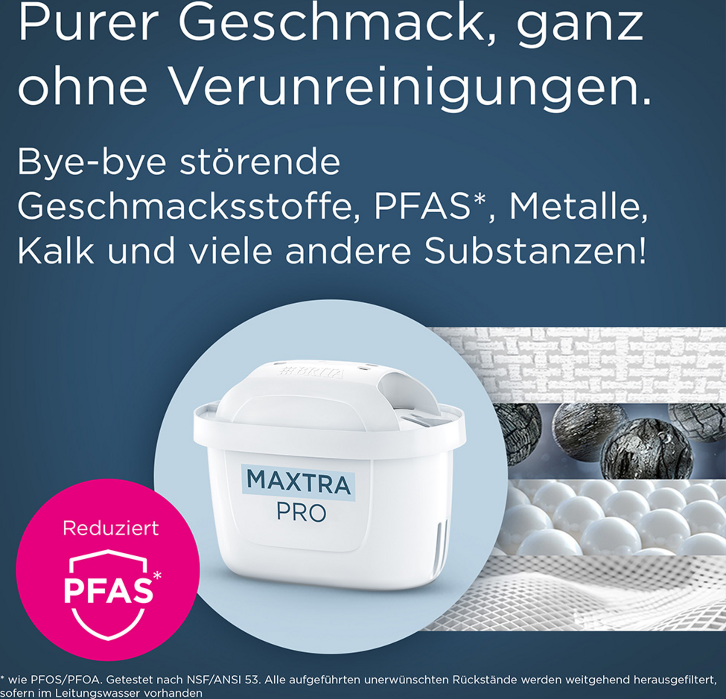 - Purer Geschmack, ohne Verunreinigungen: Filtert störende Geschmacksstoffe (Chlor), feinste Partikel (≥ 30 µm), Mikroverunreinigungen wie PFAS (wie PFOS/PFOA, getestet nach NSF/ANSI 53), Metalle, bestimmte Herbizide, Pestizide, Medikamente/sofern im Wasser