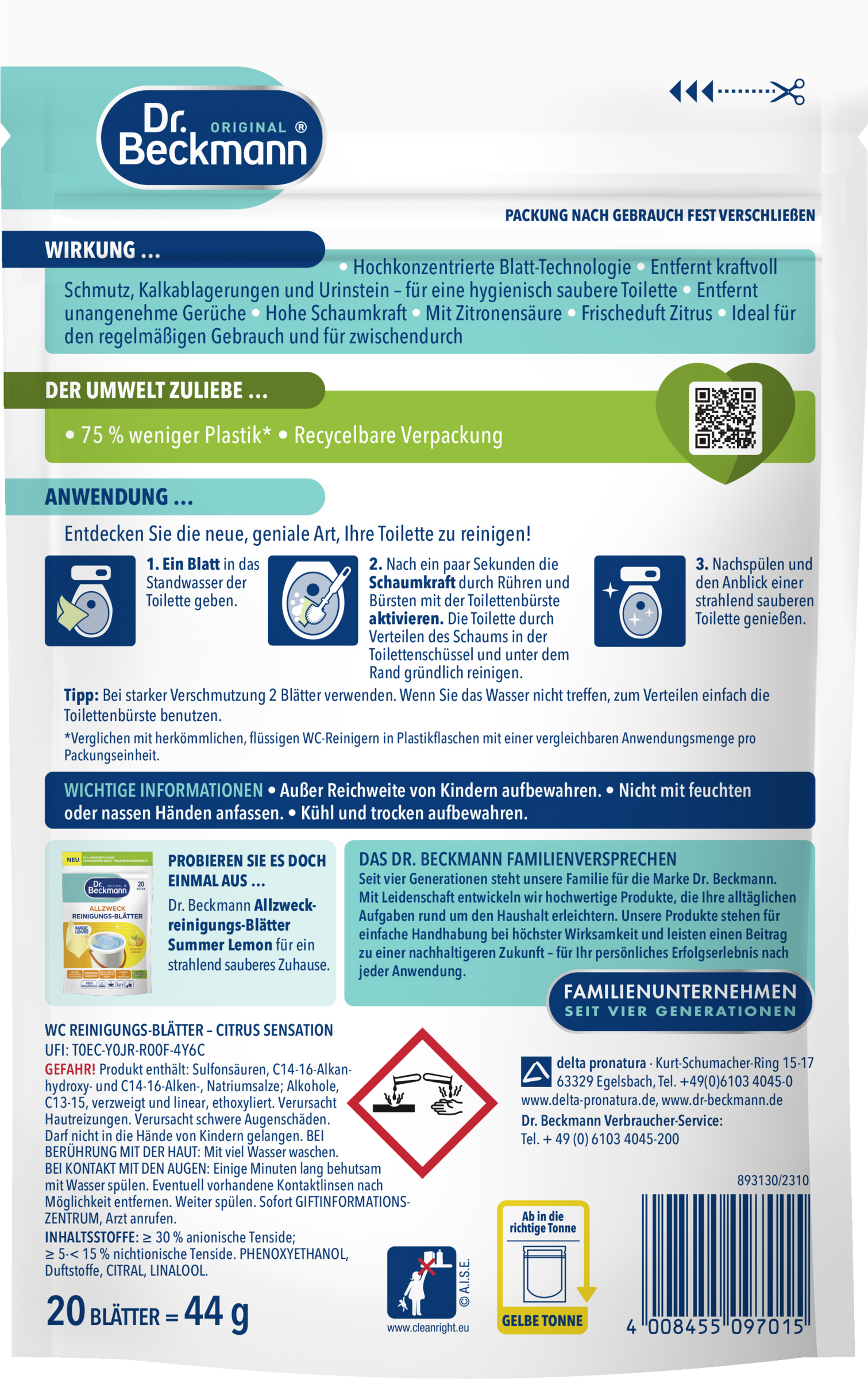 - 75 % mindre plast - sammenlignet med konventionelle flydende toiletrens i plastflasker med en sammenlignelig anvendelsesmængde pr. emballageenhed