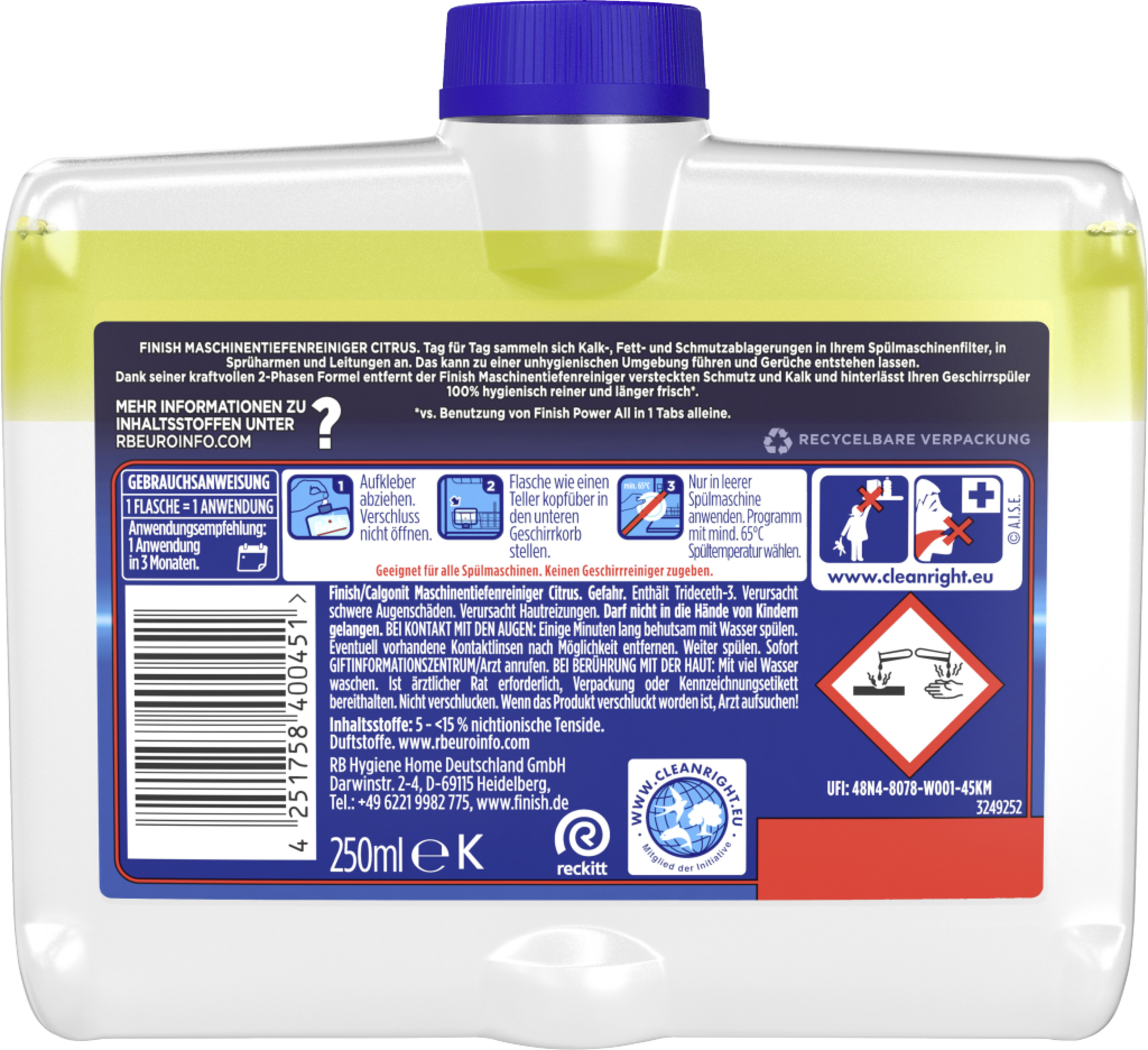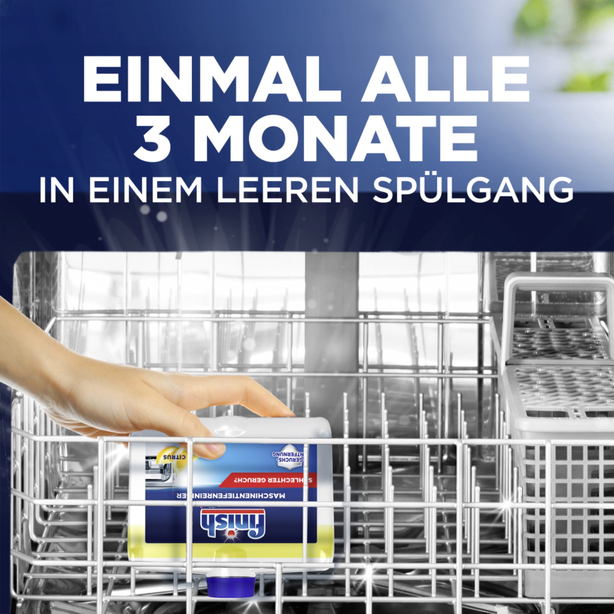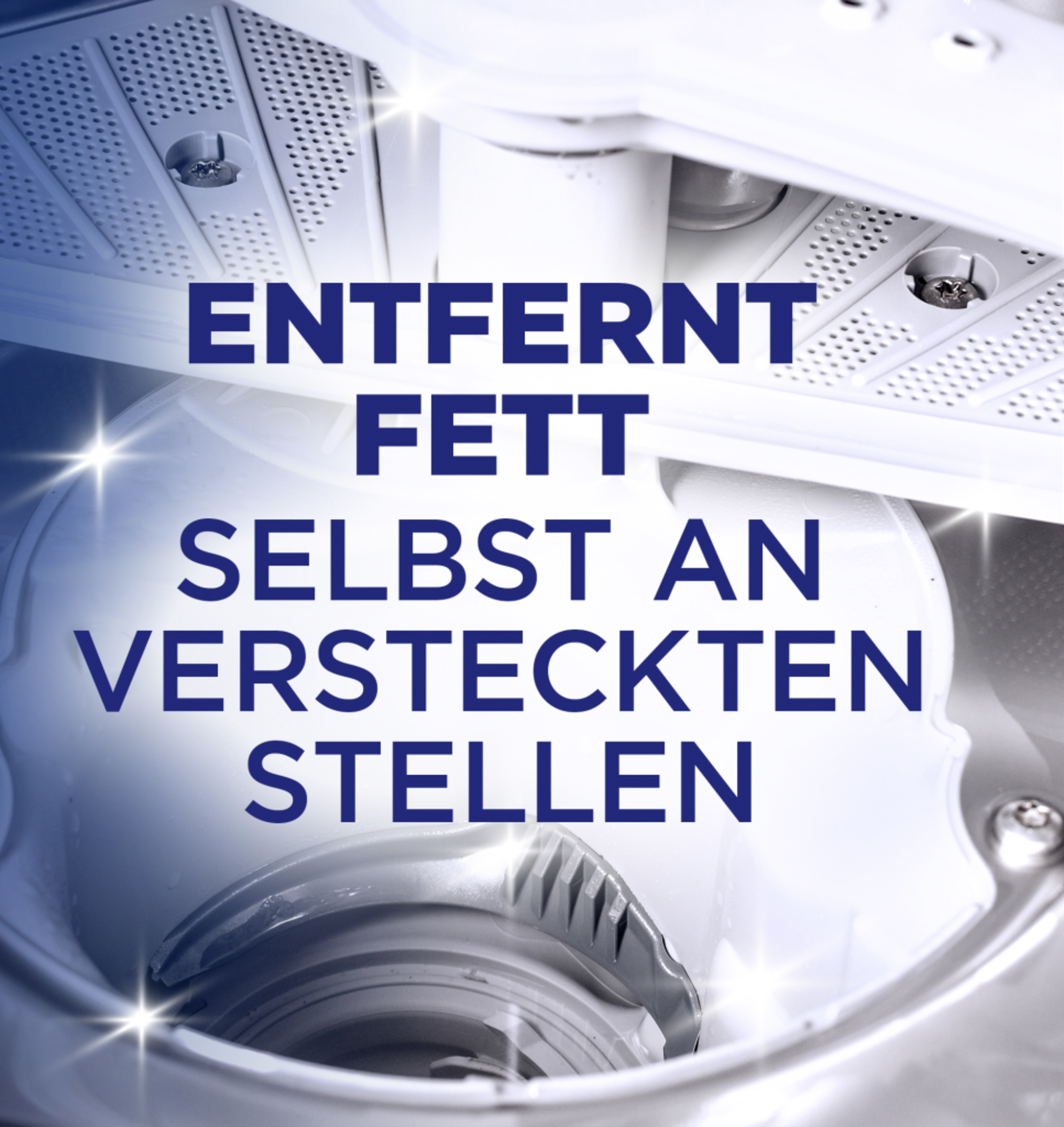 Dag efter dag samles aflejringer af kalk, fedt og snavs i opvaskemaskinen, vaskearmene og rørene. Dette kan medføre et uhygiejnisk miljø og skabe lugt. Takket være dens kraftfulde 2-fasede formel fjerner Finish maskinens dybderens skjult snavs og kalk og efterlader din opvaskemaskine 100 % hygiejnisk renere*.