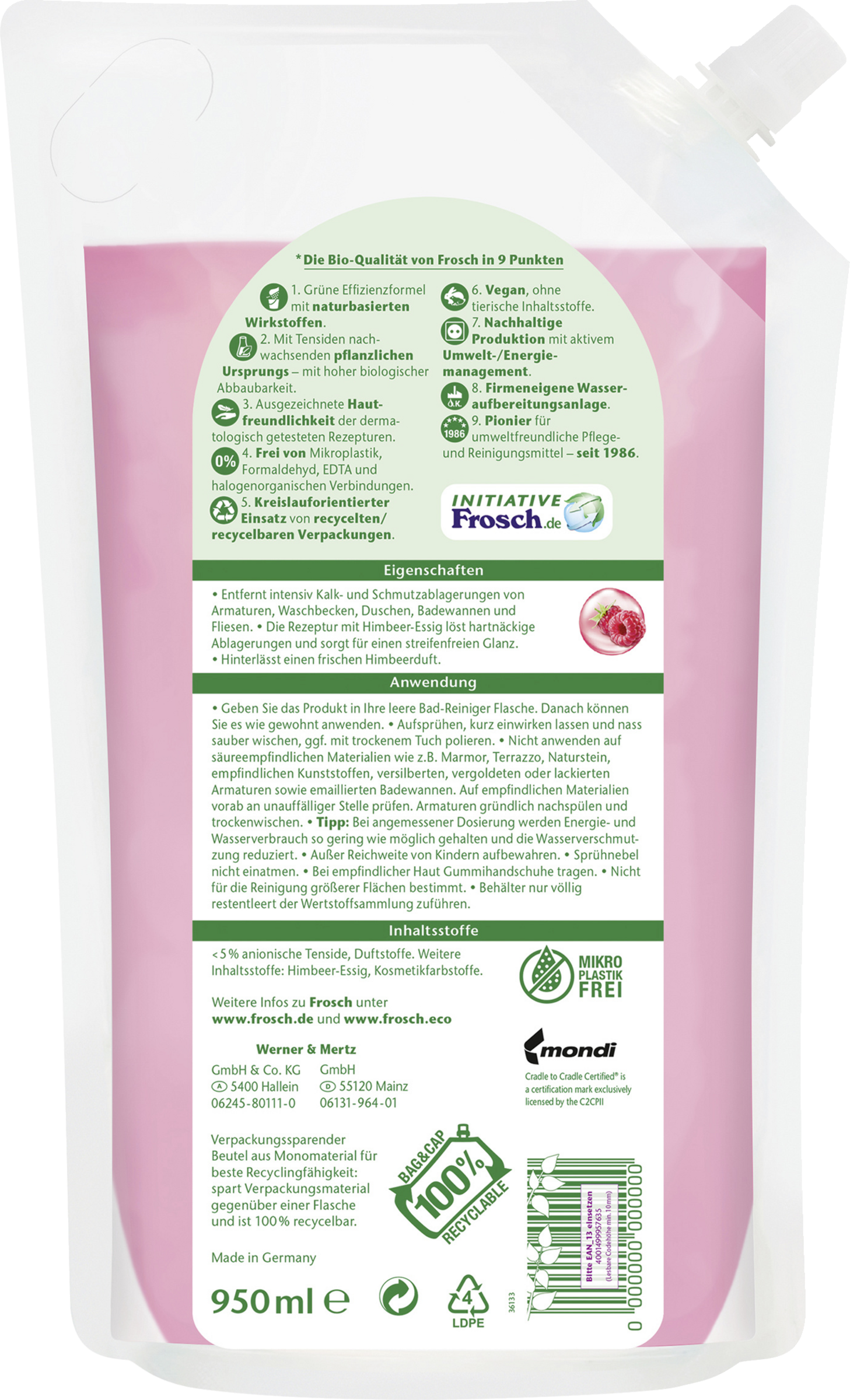 Frosch hindbæreddike anti-kalk fjerner selv genstridige kalk- og snavsrester fra armaturer, badekar, Bad og fliser. Den kraftfulde Formel med hindbæreddike og syrer renser køkkenet og badeværelset skinnende rent og efterlader en frisk hindbærduft.