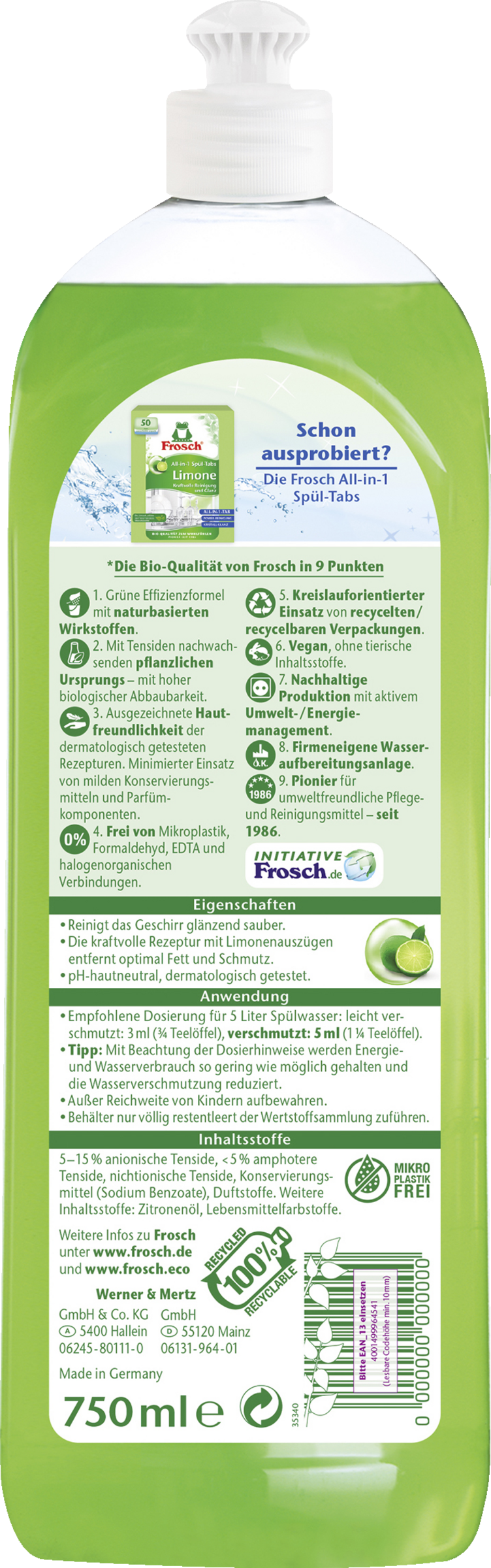 Frosch Lime Opvaskemiddel renser opvasken skinnende rent. Formel baseret på plantebaserede Tensider sikrer optimal fedt- og smudsopløsende kraft og efterlader en behagelig frisk citronduft. Opvaskemiddel er pH-neutral , og dets meget gode Hudvenlighed er dermatologisk testet.