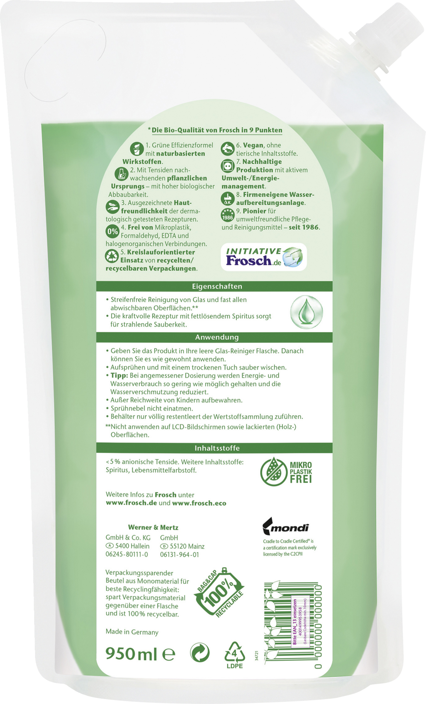 Frosch Spirit Glass Cleaner rengør glas, bilruder og næsten alle glatte overflader uden striber. Takket være formlen med den dokumenterede, effektive og aktivt fedtopløsende alkohol fjerner den fedt, støv, hårspray-rester og makeup fra dem og efterlader samtidigt en stribefri glans og strålende renhed.
