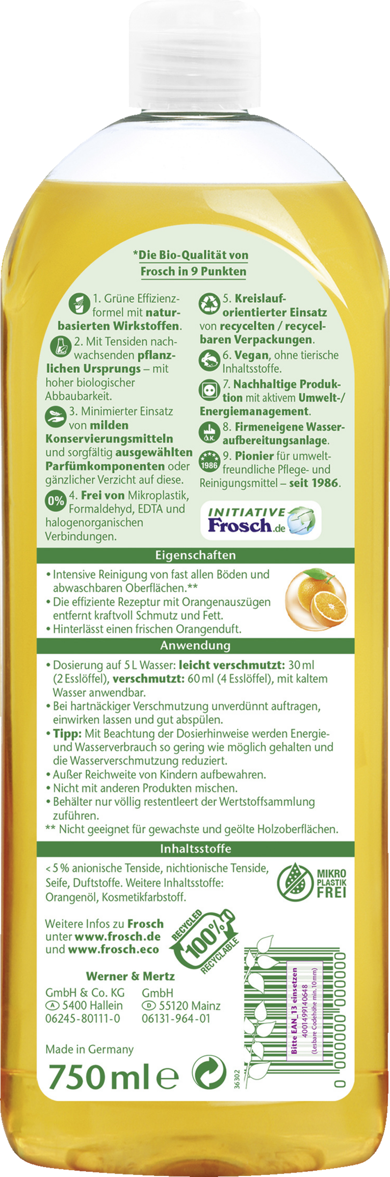 weniger als 5% anionische Tenside, nichtionische Tenside, Seife, Duftstoffe (Limonene, Linalool, weitere Duftstoffe). Weitere Inhaltsstoffe: Orangenöl, in geringen Mengen Kosmetikfarbstoff.