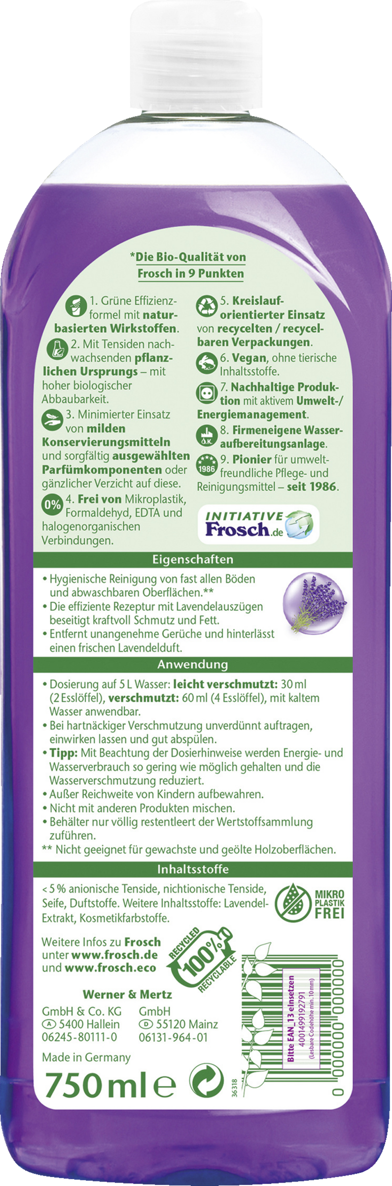 Frosch Lavendel Universal Cleaner fjerner kraftfuldt fedt og snavs og sikrer restfri rengøring og hygiejnisk renlighed for næsten alle aftørrelige overflader og gulve. Den fjerner ubehagelig lugt og spreder en behagelig frisk lavendelduft i hele huset. Dermatologisk testet.