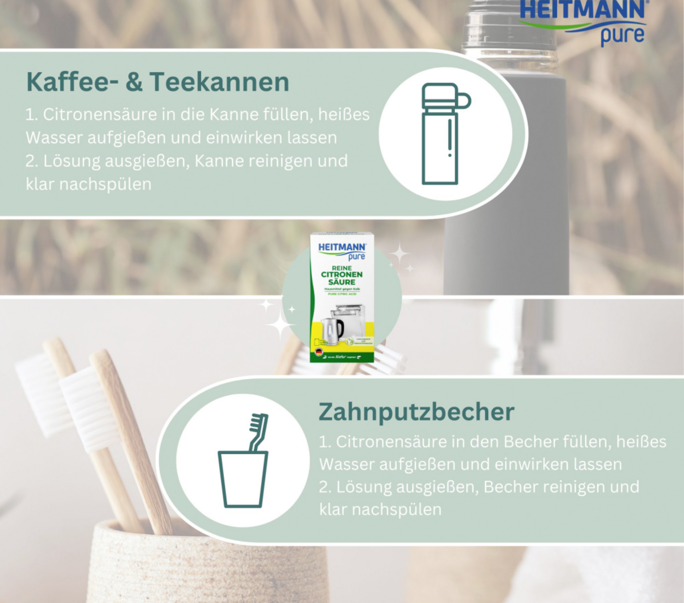 For at fjerne striber og aflejringer skal du komme ½ –1 spsk. (10–20 g) HEITMANN Pure Lemon Acid i beholderen og opløse det med varmt vand. Lad det virke kortvarigt, og skyl grundigt.