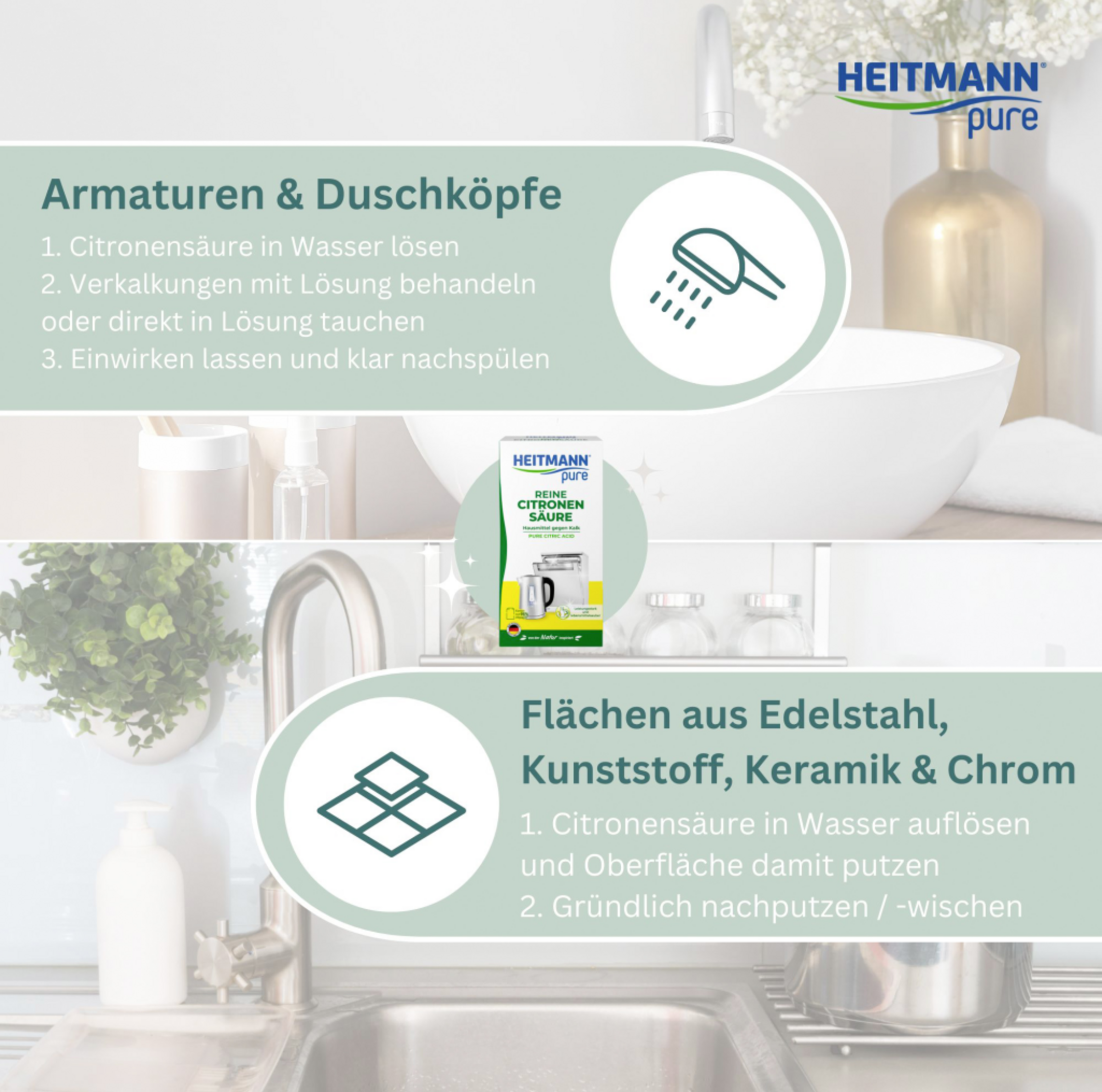 Heitmann Pure Citronsyre opløser kalkaflejringer i køkken og bad kraftfuldt og fødevaresikkert
