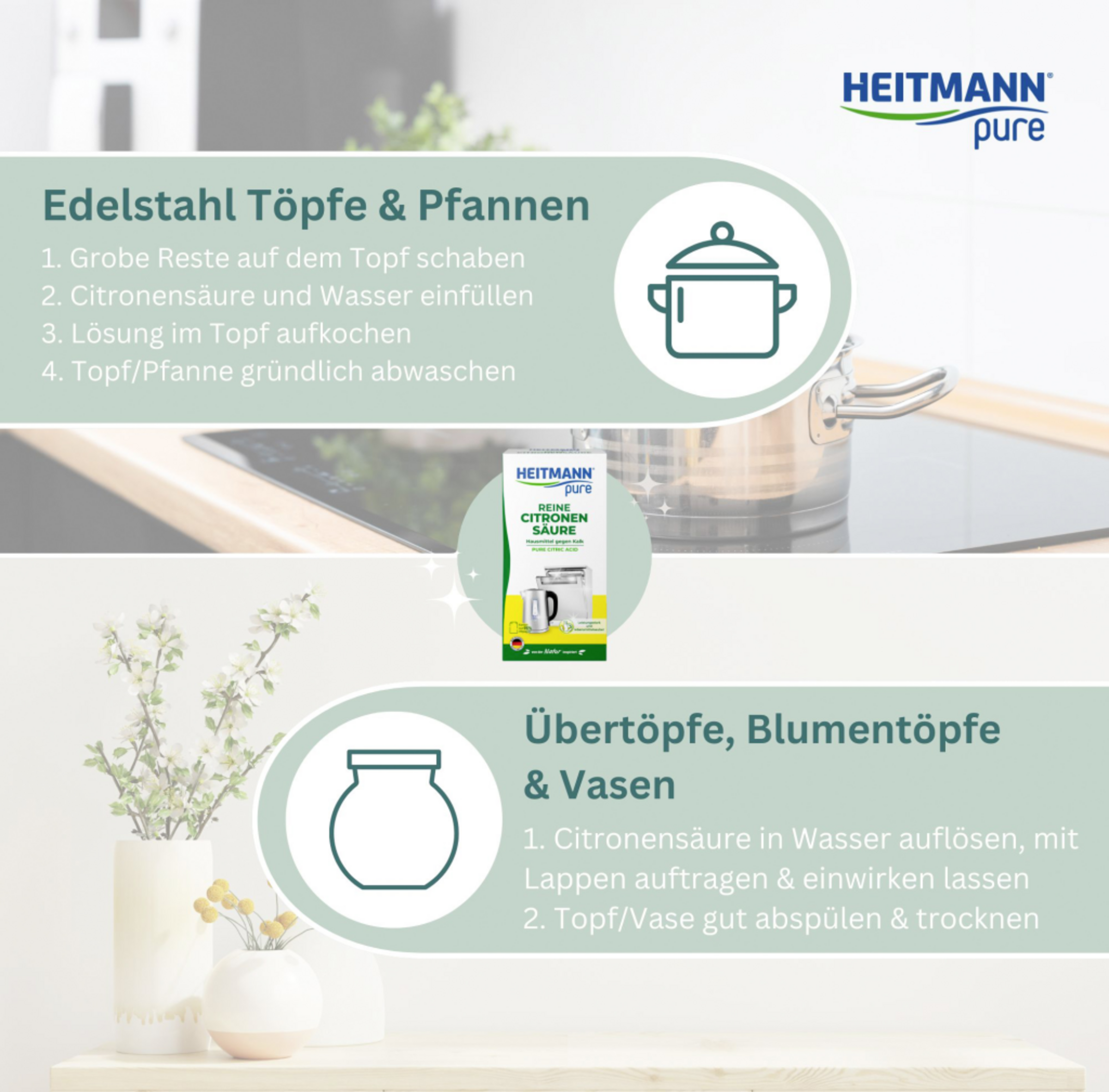 Opløs ½–2 spsk. (10–20 g) HEITMANN Pure Lemon Acid i 1 kop vand. Opkog opløsningen i gryden/panden, og lad den koge i et par minutter. Skyl derefter grundigt.