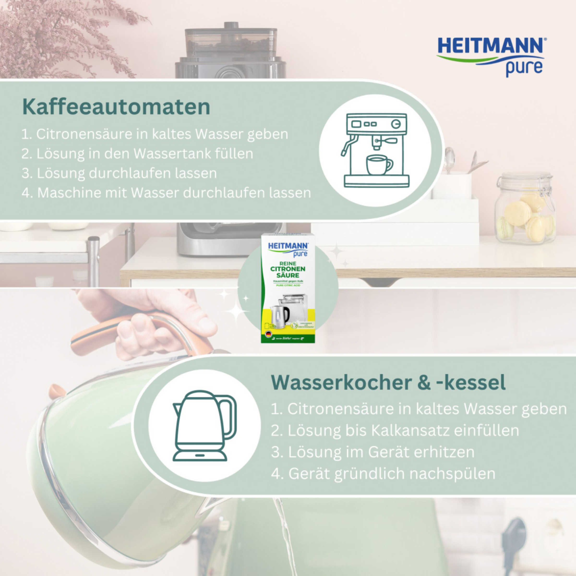 Opløs 2–3 spsk. (40–60 g) HEITMANN Pure Lemon Acid i 1 l koldt vand. Fyld opløsningen i enheden indtil kalkaflejringen, og opvarm den i den. Lad det virke kortvarigt. Skyl grundigt. Stil dypkogeren i opløsningen, opvarm den, og skyl den derefter.