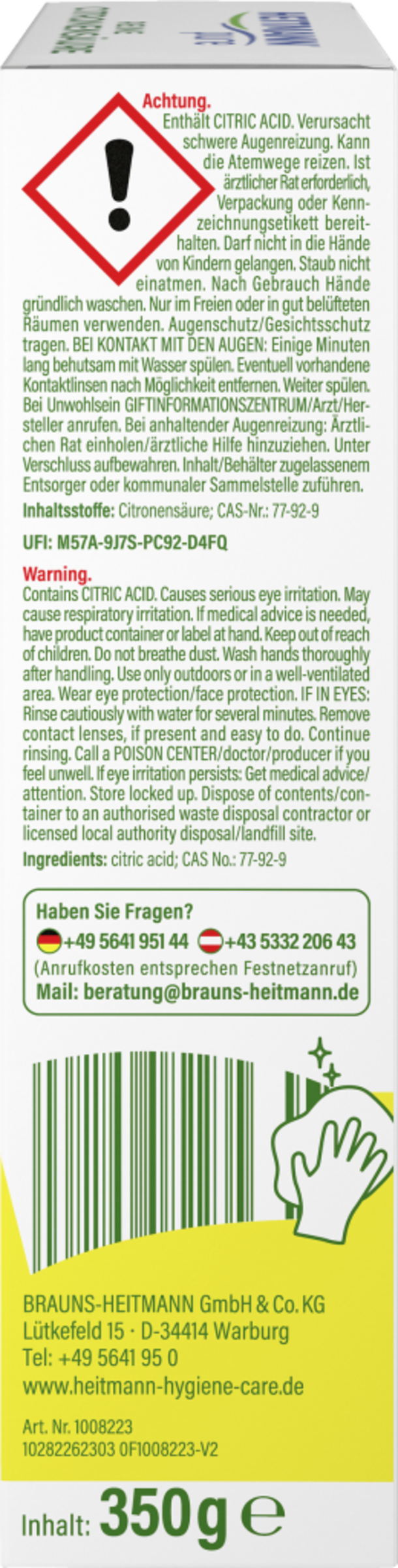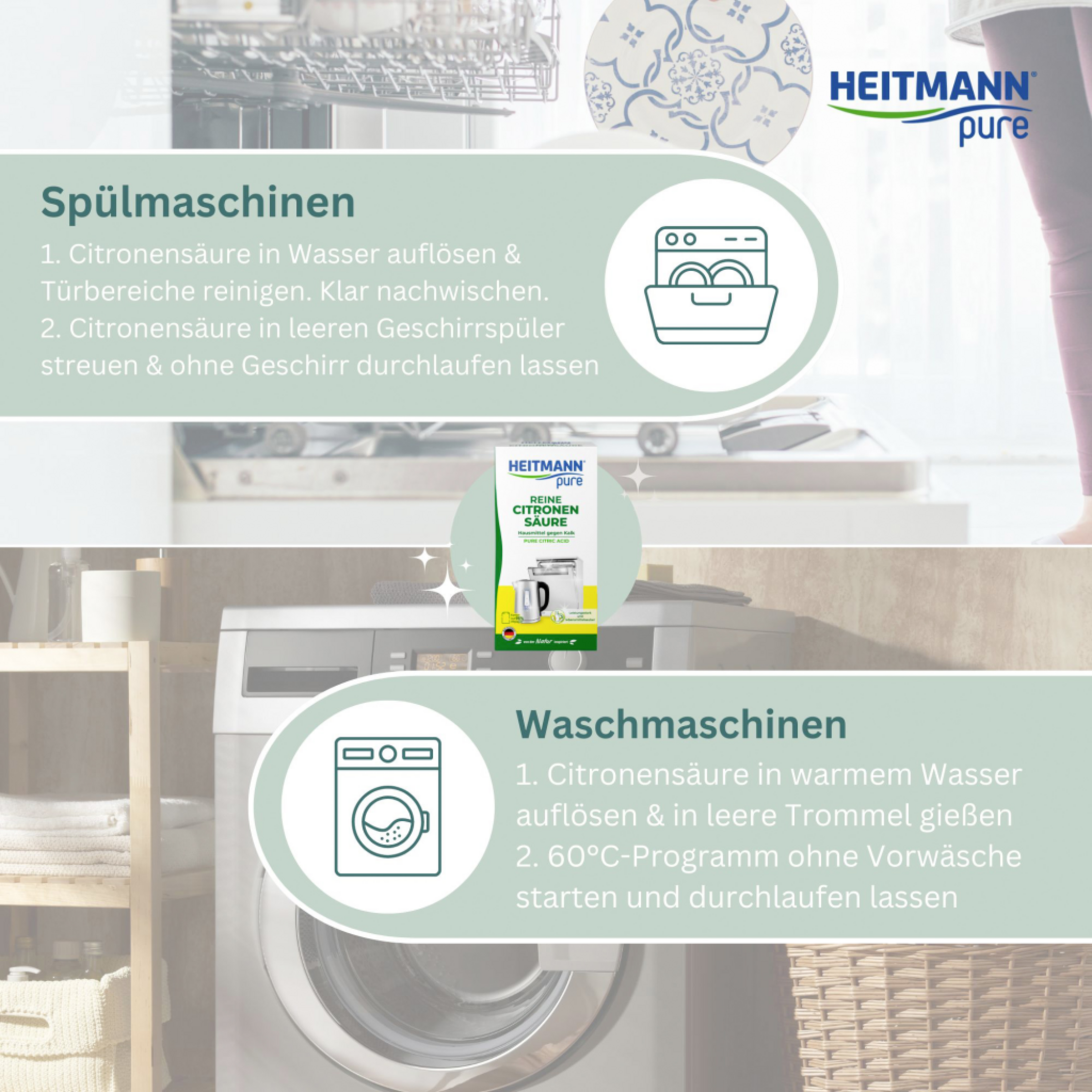 Rengør først dørområdet. Opløs dertil 2 spsk. (40 g) HEITMANN Pure Lemon Acid i ½ kop varmt vand, og tør overfladerne af. Fordel derefter yderligere 6 spsk. (120 g) i den tomme opvaskemaskine, men undgå sien. Vælg et program uden skylning (min. 50 °C), og lad det køre uden service.