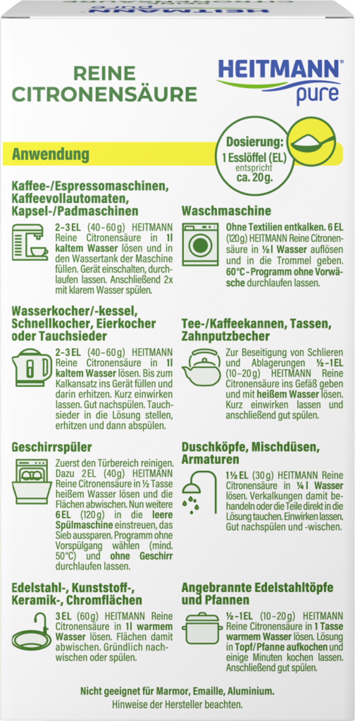 Opløs 1 ½ spsk. (30 g) HEITMANN Pure Lemon Acid i 1/4 l vand. Behandl tilkalkninger med den, eller neddyk delene direkte i opløsningen, og lad den virke. Skyl og tør grundigt af.
