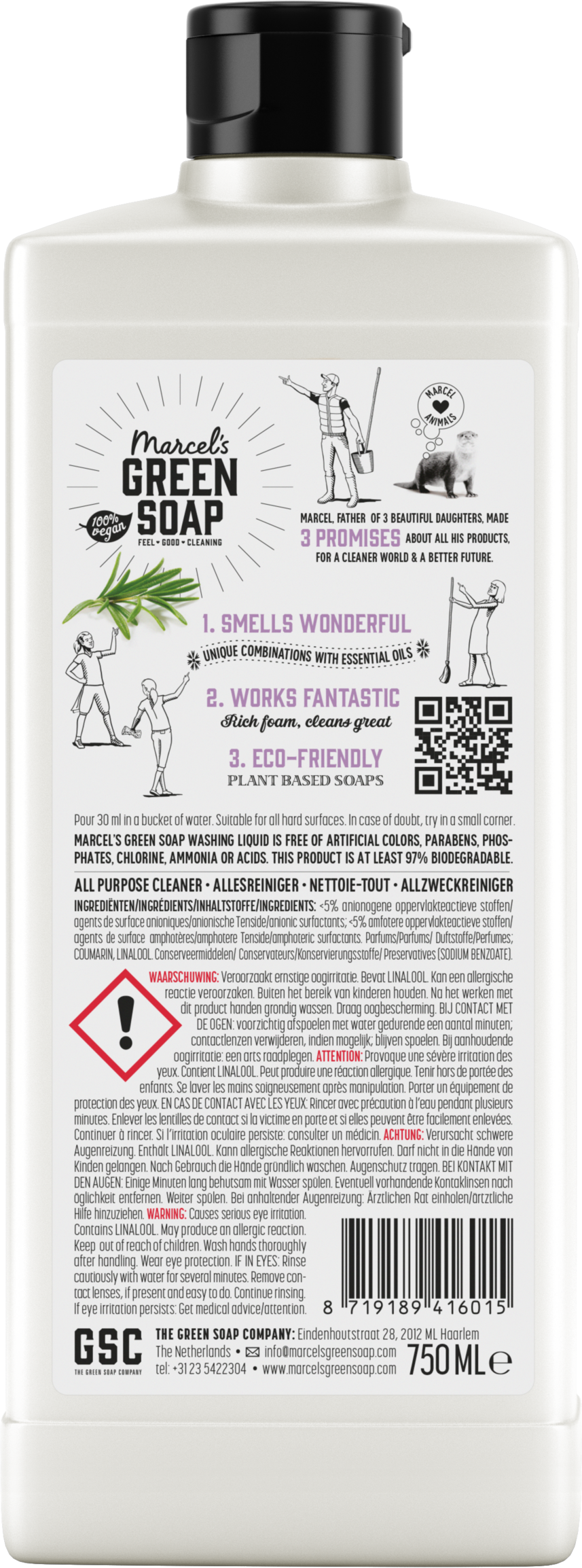 Smuk og bæredygtig, vask, gulv, badeværelse og køkken, alt bliver rent som aldrig før og derudover: Alt lugter vidunderligt frisk igen! Som alle Marcel's Green Soap-produkter indeholder vores universalrengøringsmiddel ikke farvestoffer, parabener, fosfater, klor, ammoniak eller syrer. Baseret på naturen, mindst 97 % biologisk nedbrydelig og 100 % vegansk!