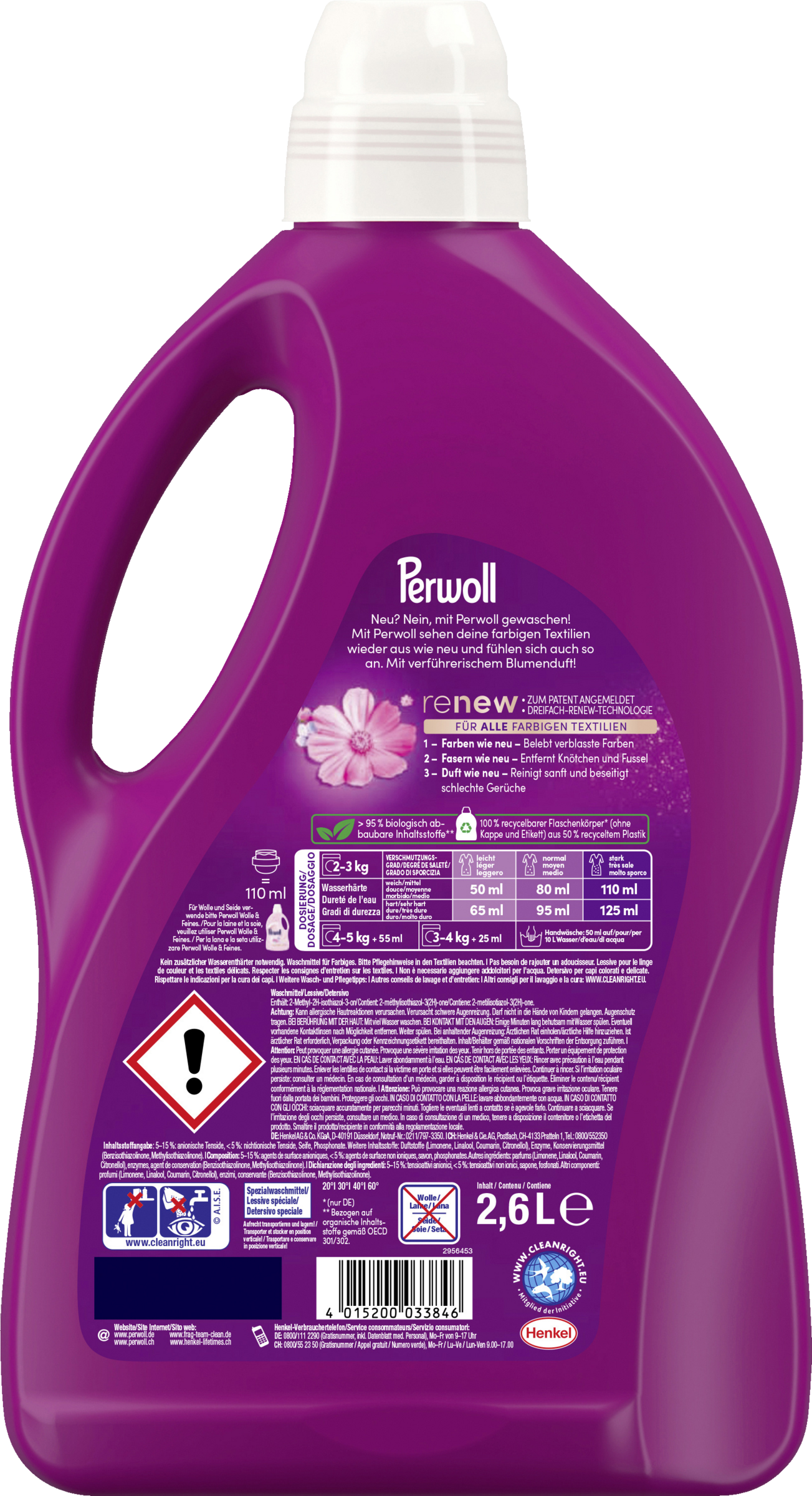 Perwoll Renew Color – den ideelle pleje til dit yndlings farverige tøj! Gel-vaskemidlet sikrer ikke kun en blid renlighed, men revitaliserer også farver og fornyer fibre for intenst lyse farver og en særlig glat fornemmelse - til tøj, der føles og ser ud som nyt. Det skånsomme vaskemiddel kan bruges ved lave og høje vandtemperaturer, standard- og specialvaskeprogrammer og til Håndvask . Perwoll Renew Color er velegnet til Anvendelse på en række forskellige tekstiler, herunder sarte stoffer. Vaskemidlet er ikke kun godt for dit tøj, men også skånsomt mod planeten: Formlen indeholder 90% naturbaserede ingredienser, mens flasken er lavet af 50% genbrugsplast og er fuldt genanvendelig.