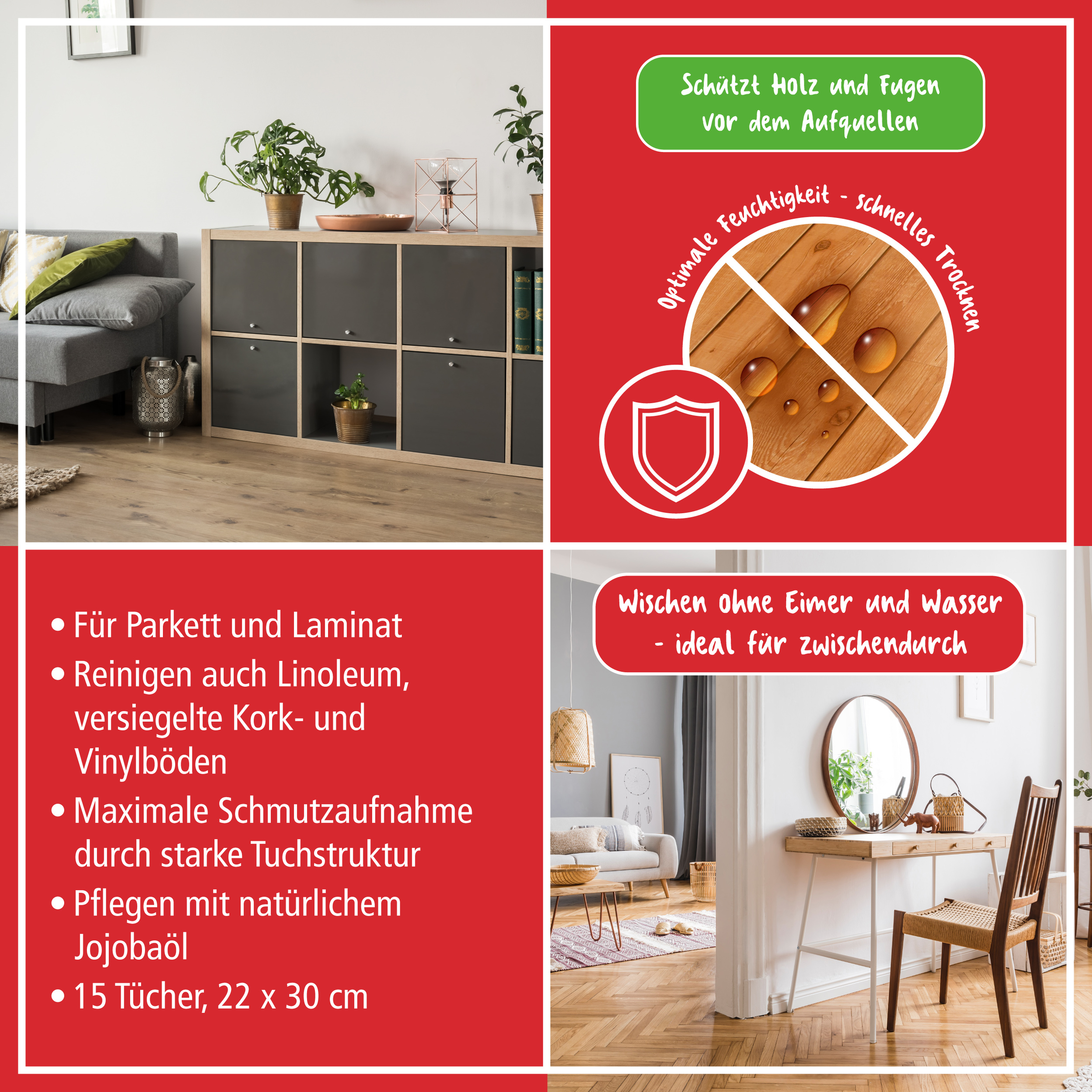 POLIBOY parkett laminat vådklude er udviklet til bekvem rengøring og pleje af parket- og laminatoverflader. Trapper og gulve rengøres i en håndevending uden gulvspand. Den optimale befugtning af kludene sikrer grundig rengøring og forhindrer samtidig, at gulvet og fugerne svulmer op. Kludens bikagestruktur sørger derudover for perfekt renhed selv på stærkt belastede gulve. Samtidig beskytter og plejer naturlig jojobaolie træoverfladerne.