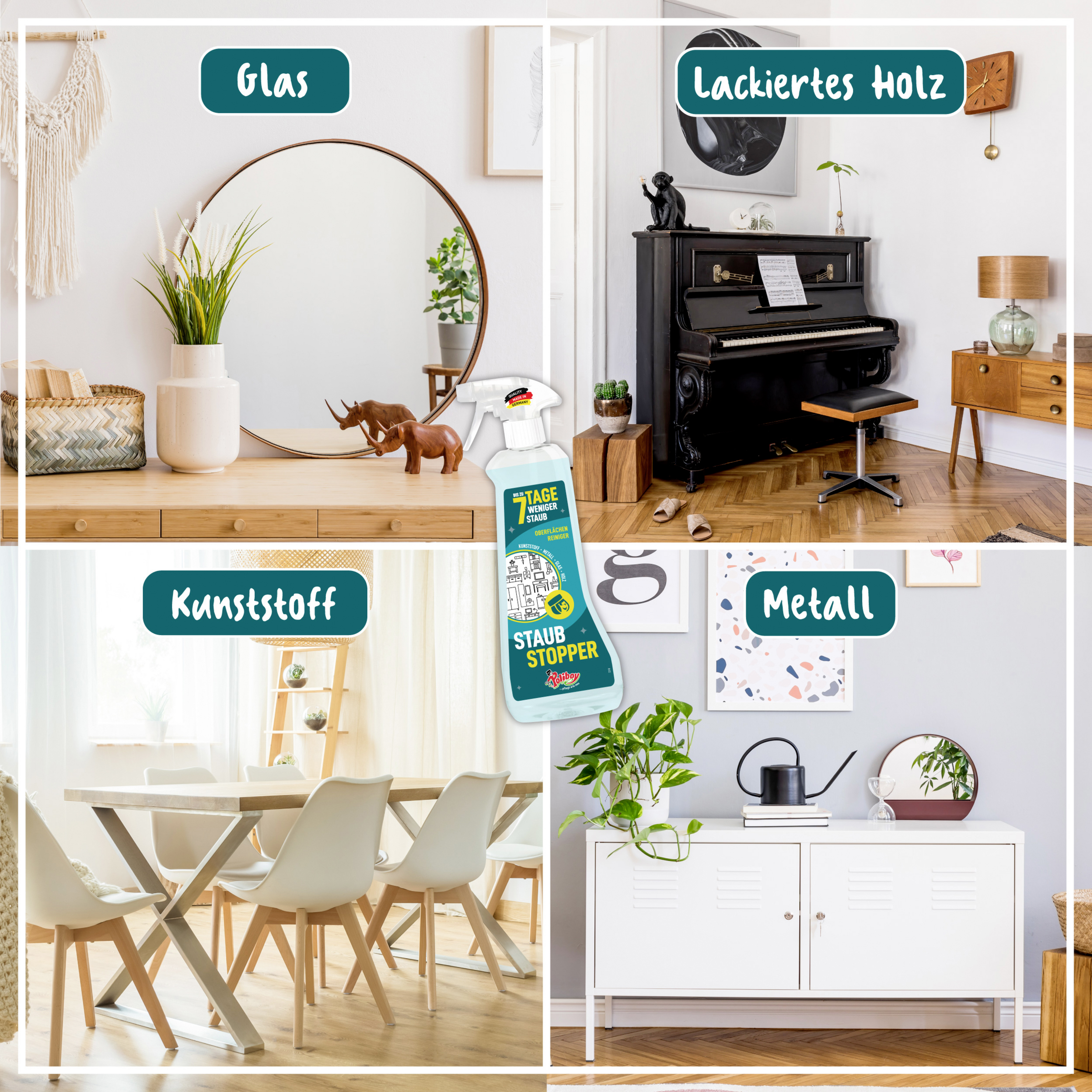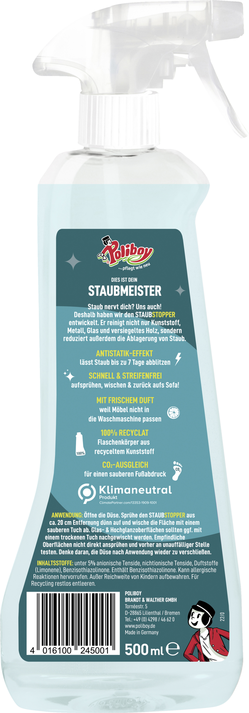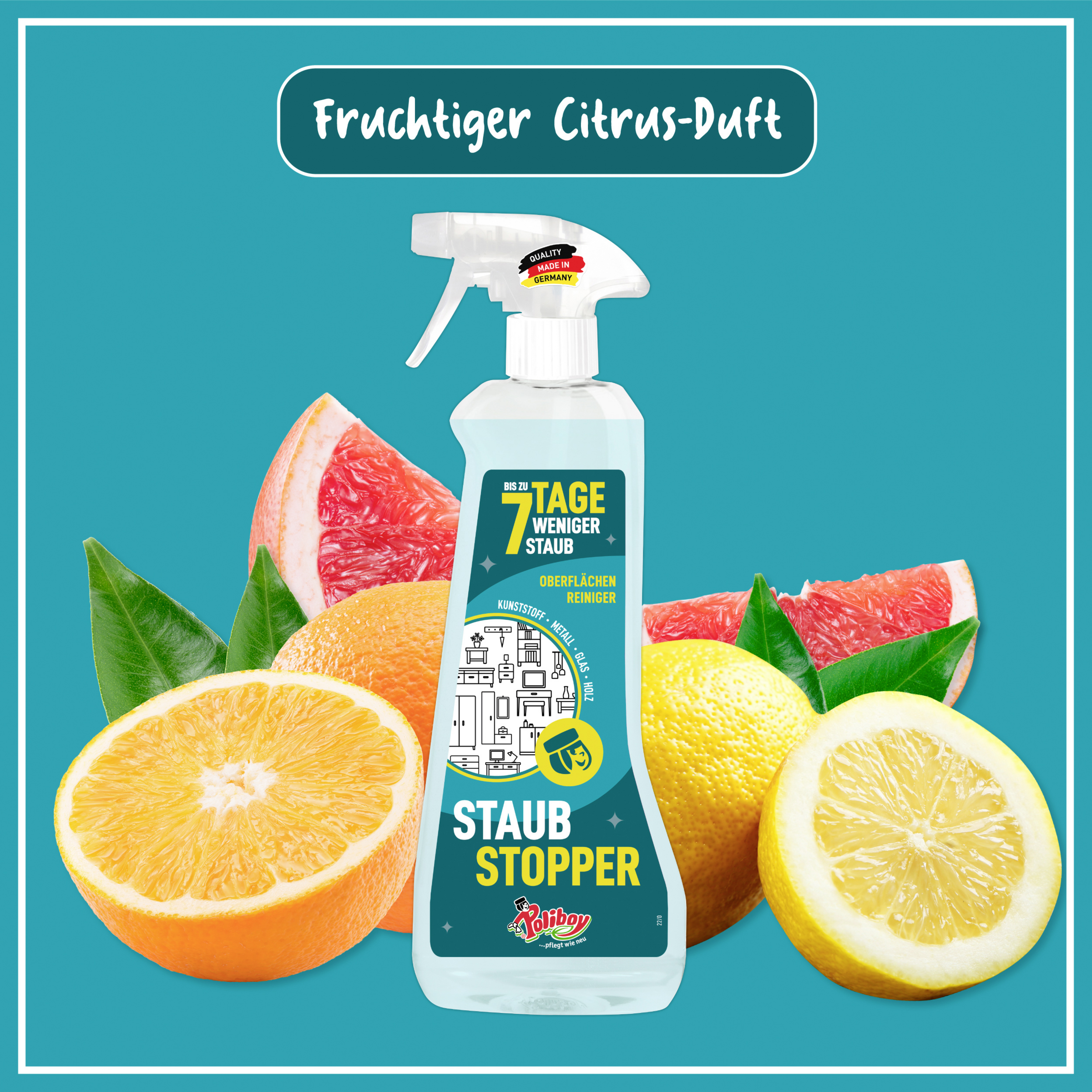 Støv irriterer dig? Så er POLIBOY-støvproppen det ideelle produkt til dine feel-good-rum. Det renser ikke kun Plast, metal, glas og forseglet træ, men reducerer også de støvede aflejringer på dine møbler. Ja, du hørte det rigtigt! Den antistatiske effekt holder støv væk i op til 7 dage. Fordi møbler desværre ikke passer i en vaskemaskine, dufter støvproppen også behageligt frisk og er hurtig at bruge: Spray blot på, tør af og gå tilbage i sofaen! Proppen fjerner ubesværet fedtede fingeraftryk og andre spor fra hverdagen, så du kan læne dig tilbage oftere.
