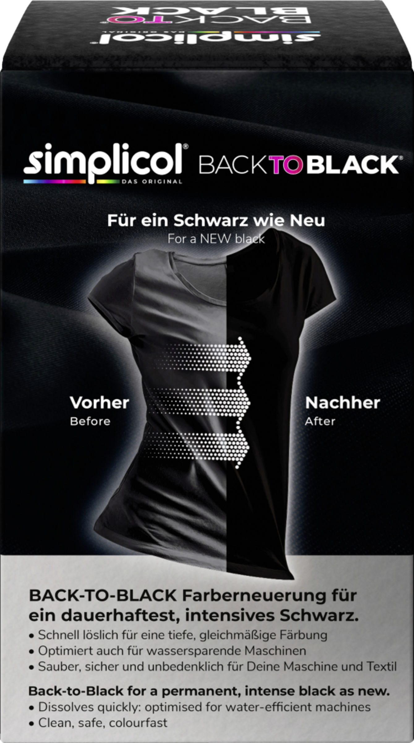 Dine foretrukne sorte jeans bliver blegere med hver vask? Giv dit tøj en intensiv sort tilbage nu. Med Back-to-Black kan du opfriske farven på sorte tekstiler. Får dit tøj til at se ud som nyt.