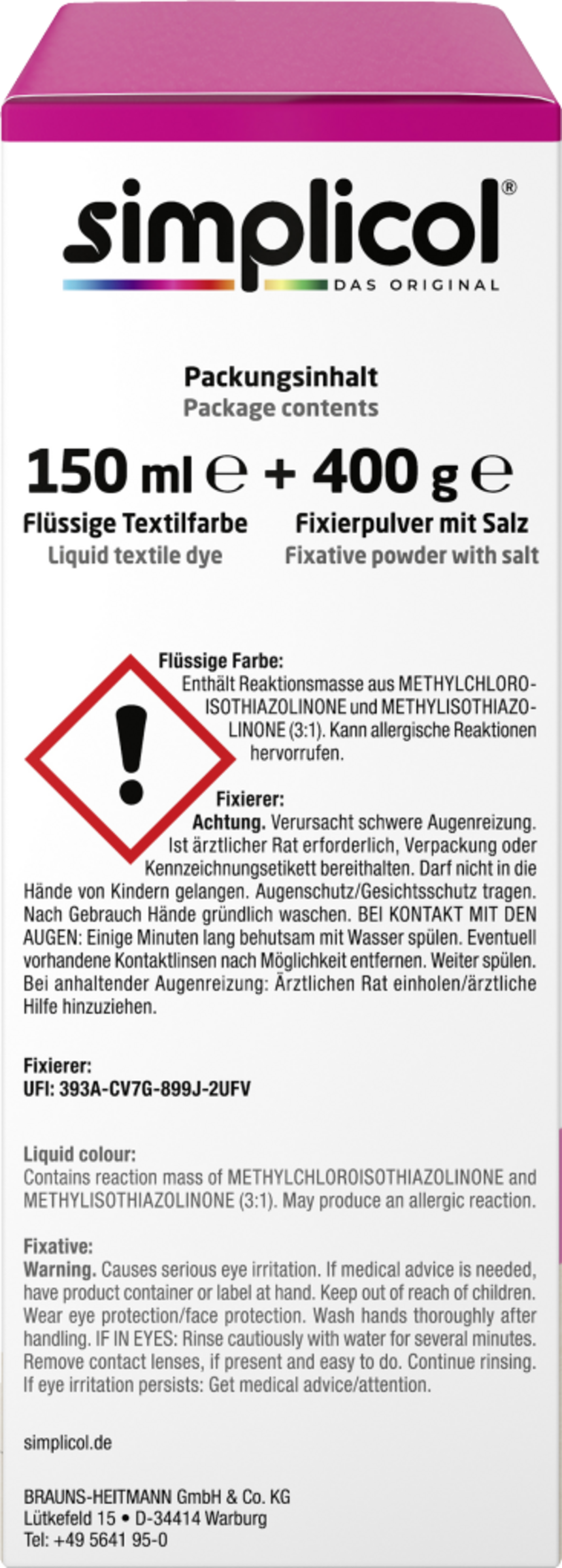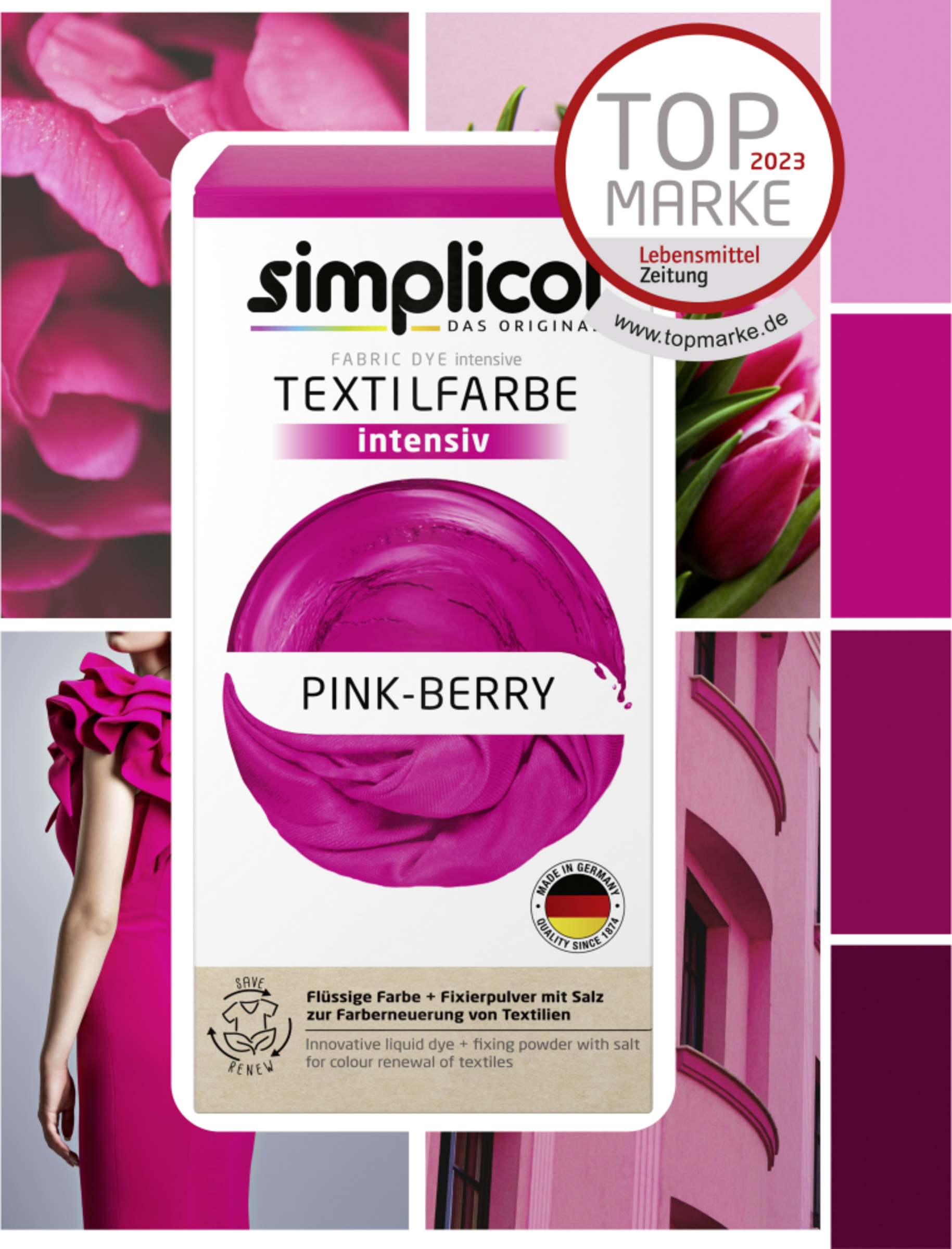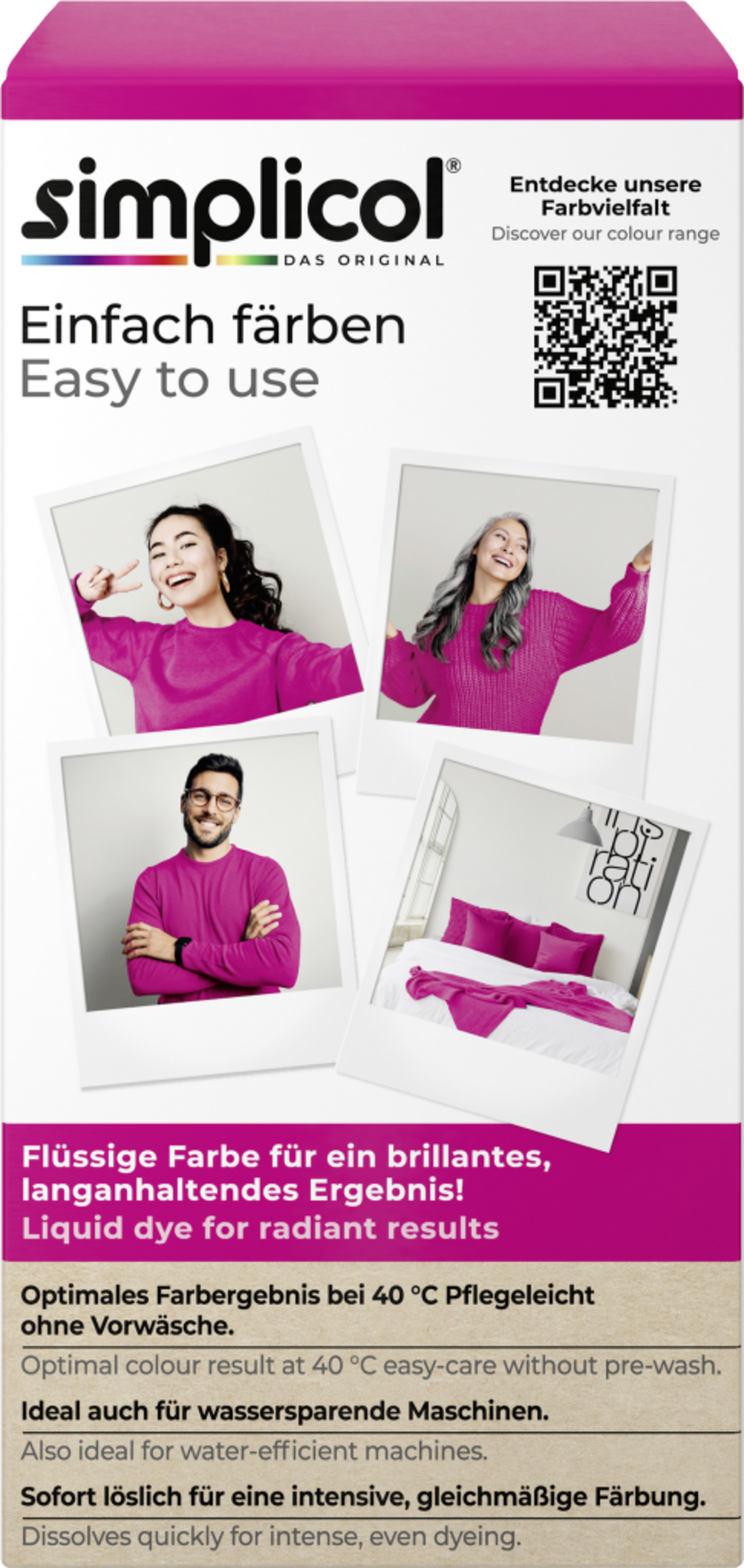 Elsk farver, lev kulørt: Det er meget nemt med simplicol intensiv tekstilfarve. Giv dit tøj og tekstiler til hjemmet et nyt look i bare én vaskecyklus. Simplicol intensiv tekstilfarve er velegnet til alle tekstiler af bomuld, viskose, hør og blandingsstoffer. Varen indeholder flydende farve og fikseringspulver med salt