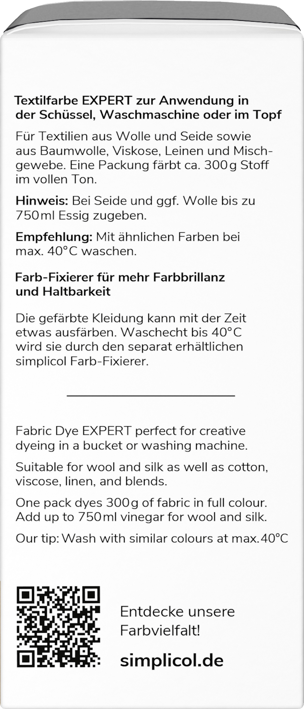 Bemærk: Til silke og eventuelt uld skal der tilsættes op til 750 ml eddike. Det farvede tøj kan blive lidt misfarvet. Til hende bliver den vaskeægte med simplicol colour fixer expert (fås separat med bestillingsnummer 532334).
