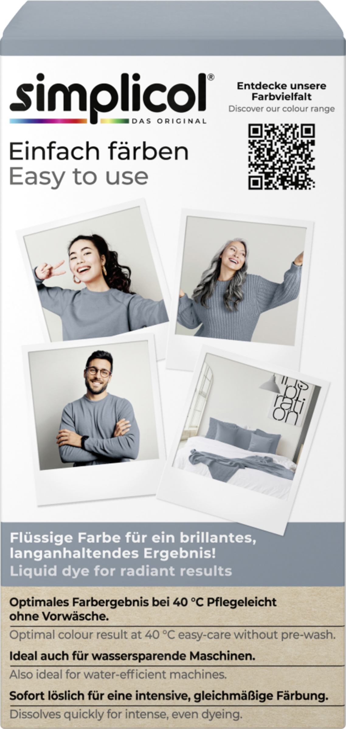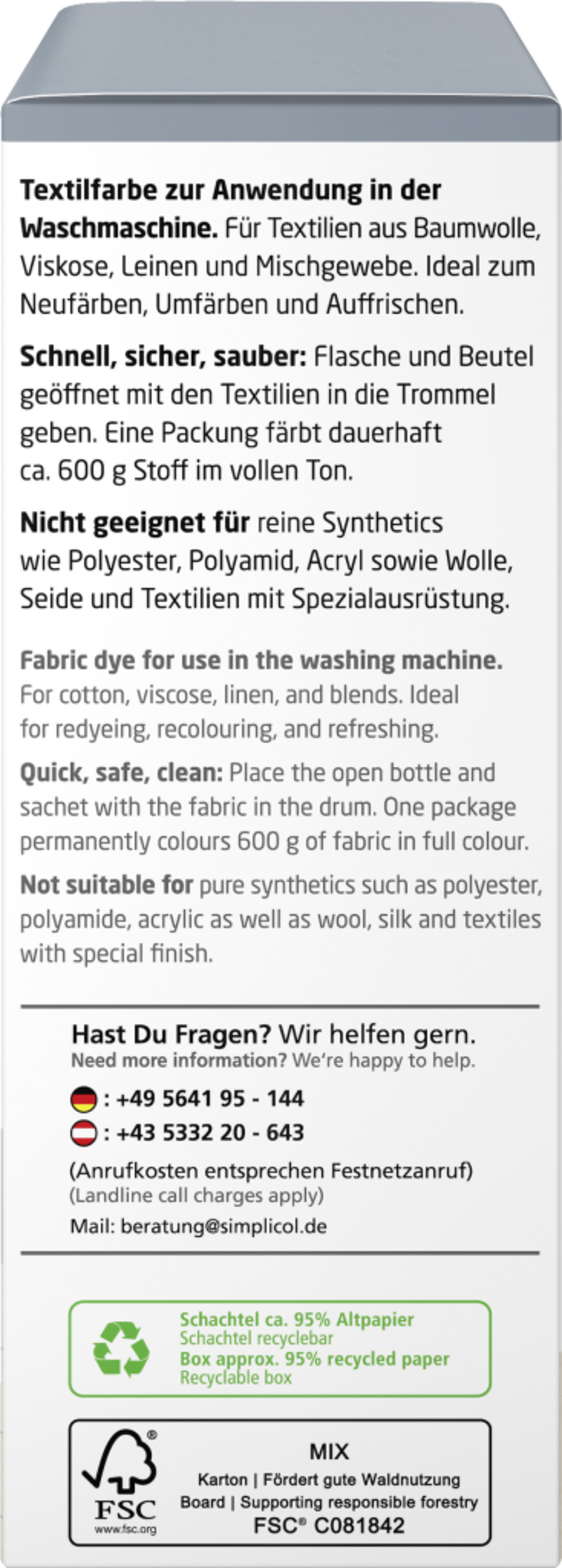 Opbevares utilgængeligt for børn. Brug højst to pakker simplicol intensiv tekstilfarve pr. farvning.