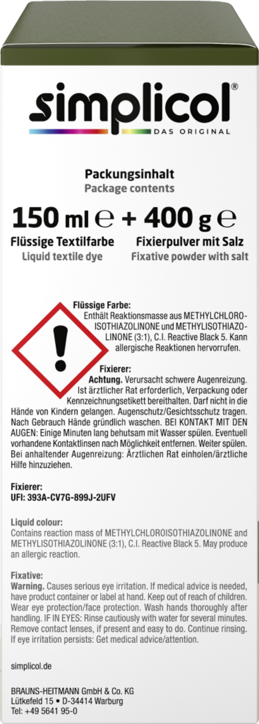 En pakke farver permanent ca. 600 g stof (tørvægt) i fuld tone. Det svarer f.eks. til et par jeans, tre håndklæder, fire T-shirts eller et badehåndklæde. Med en større mængde vasketøj bliver farvningen lysere. Du kan farve op til 1.200 g vasketøj på samme tid. Brug maksimalt to pakker simplicol intensiv tekstilfarve. Under indfarvningen binder tekstilfarven sig permanent til tekstilet. Det farvede tøj kan derefter vaskes og tørres som normalt.