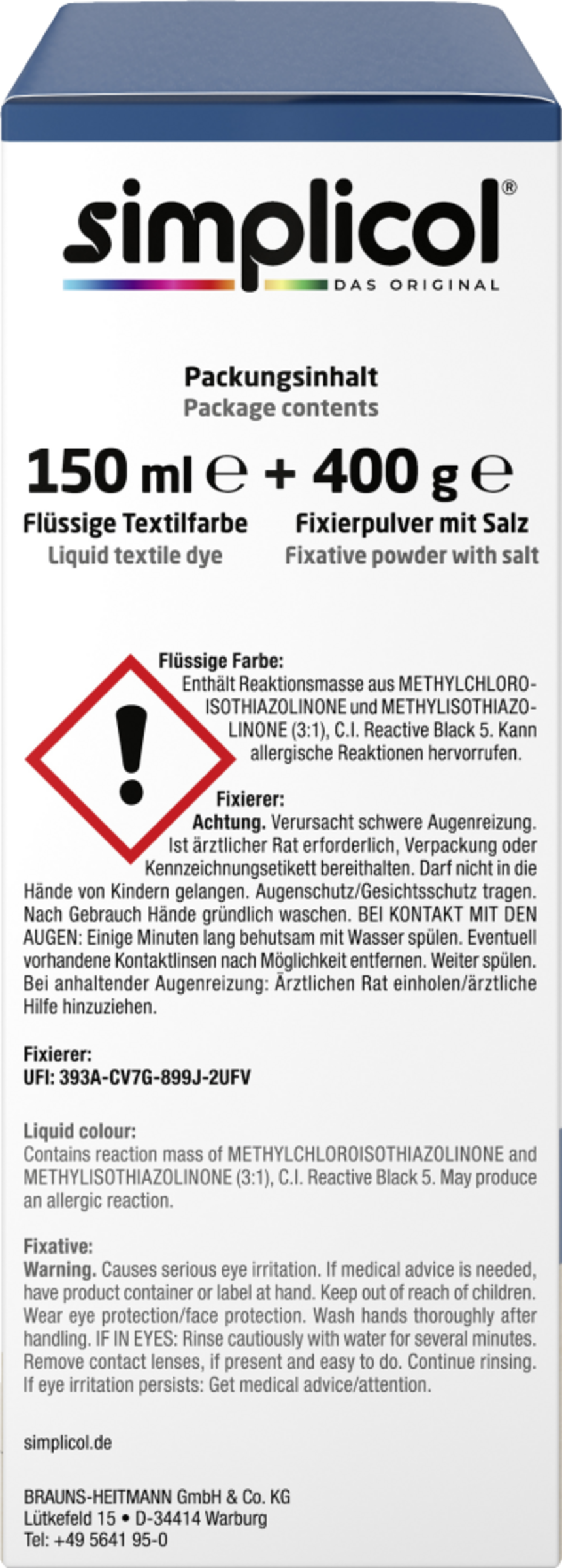 Indeholder reaktionsmasse af methylchloroisothiazolinon og methylisothiazolinon (3:1), C.I. Reactive Black 5. Kan forårsage allergiske reaktioner. Forårsager alvorlig øjenirritation. Bær øjenbeskyttelse/visir. Vask hænderne grundigt efter brug. VED KONTAKT MED ØJNENE: Skyl forsigtigt efter med vand i et par minutter. Fjern eventuelle kontaktlinser, hvis det er muligt. Fortsæt med at skylle efter. I tilfælde af vedvarende øjenirritation: Søg/tilkald læge Hvis der er behov for lægehjælp, skal du have produktbeholderen eller etiketten ved hånden. Må ikke komme i nærheden af børn.