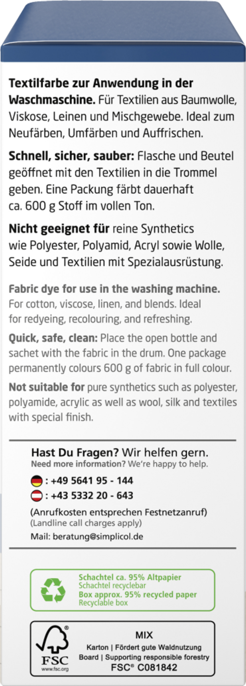 Brug maksimalt to pakker simplicol intensiv tekstilfarve. Under indfarvningen binder tekstilfarven sig permanent til tekstilet. Det farvede tøj kan derefter vaskes og tørres som normalt.