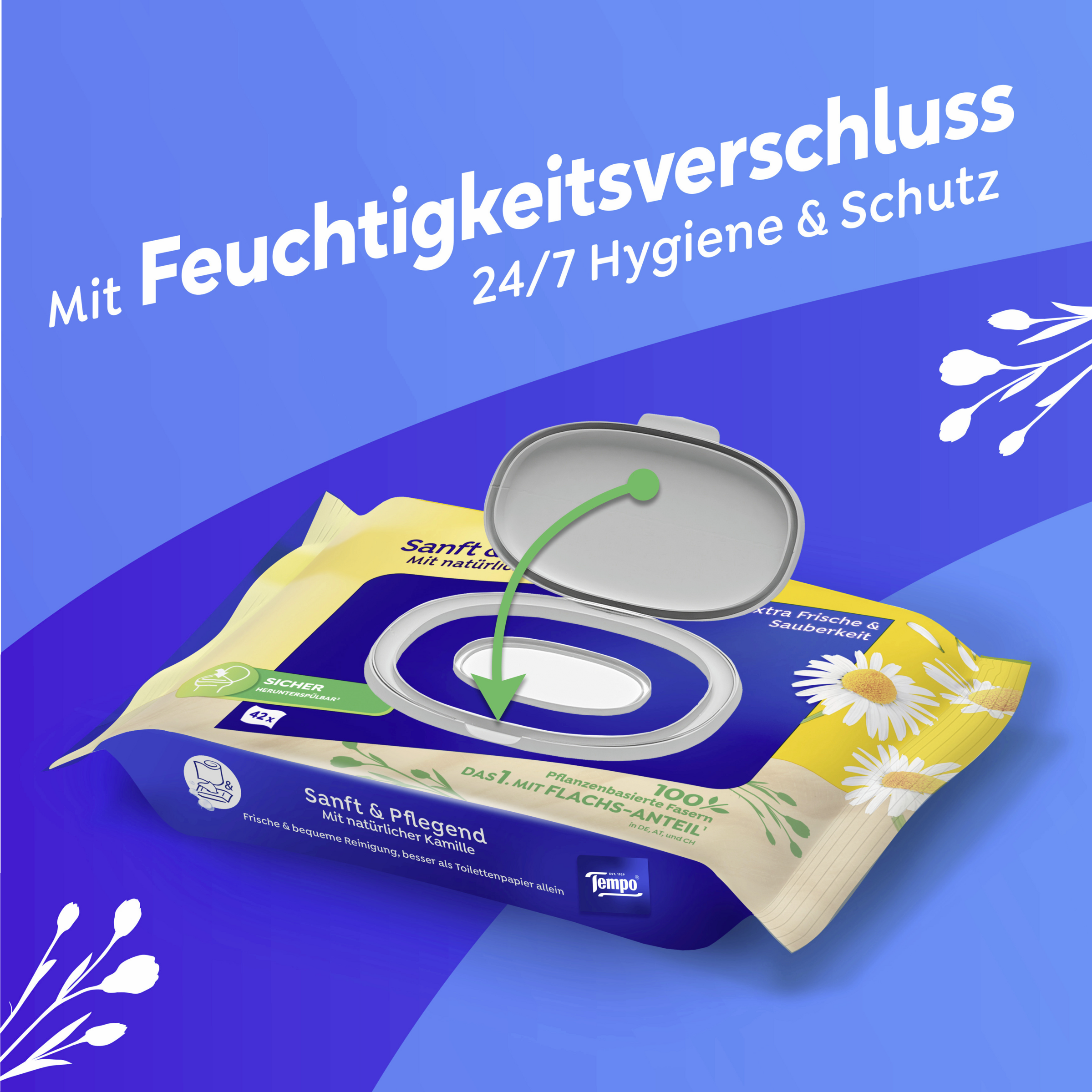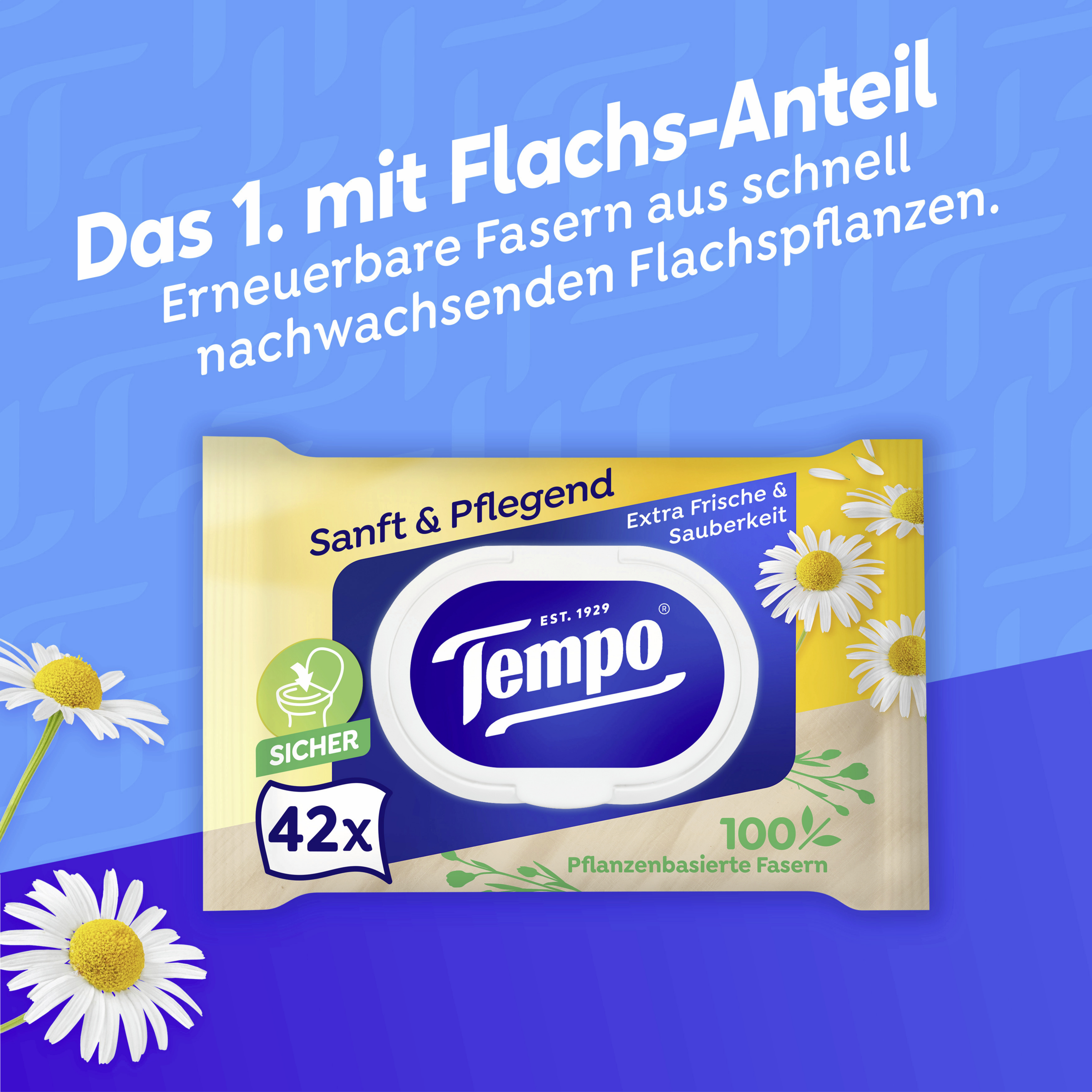 Tempo fugtige toiletpapir er fremstillet af 100 % plantebaserede fibre med indhold af hør og er udviklet for at lette presset på skovene og dermed gøre noget for vores planet. De plastfrie klude kan trygt skylles ud i toilettet ligesom tørt toiletpapir. Tempo fugtige toiletservietter er dermatologisk testet og er også velegnede til følsom hud. Integrer den perfekte 2-trins rengøringsproces med tørt toiletpapir og Tempo fugtige toiletservietter i din daglige hygiejnerutine, og føl dig pålideligt frisk hver gang. Den genanvendelige emballage*** til Tempo fugtige toiletpapir er udstyret med en fugtforsegling, der holder arkene fugtige og hygiejniske.