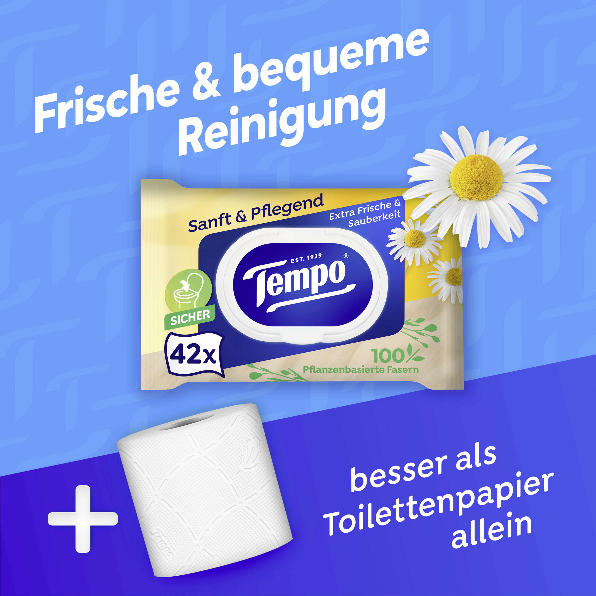 Tempo fugtige toiletservietter kombinerer pålidelig styrke og skånsom rengøring. De plastfrie, skylbare klude rengør mere hygiejnisk end tørt toiletpapir alene og er skånsomme mod din hud. Med flere varianter opfylder Tempo fugtige toiletservietter alle dine forskellige behov, så du føler dig opfrisket og plejet, samtidig med at du får den samme blide Tempo-følelse, som du kender og elsker.