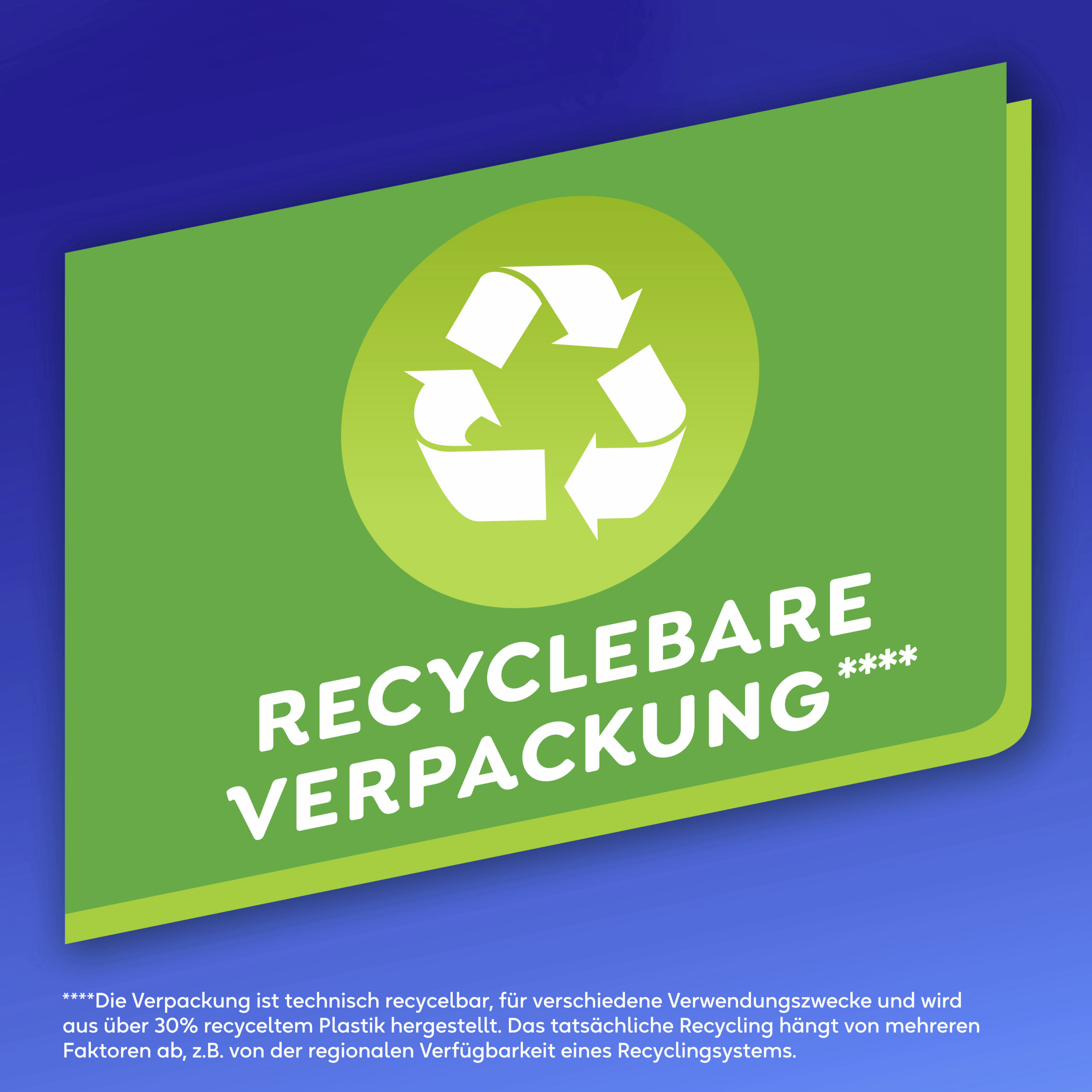 *Den ydre emballage kan genbruges i overensstemmelse med ISO 18604 til forskellige formål. Den faktiske genanvendelse afhænger af flere faktorer, f.eks. regional tilgængelighed af genanvendelsessystemer. Reduktion af emballagens CO2-fodaftryk gennem brug af genbrugsplast, baseret på livscyklusanalyser udført af Essity og verificeret af en tredjepart.