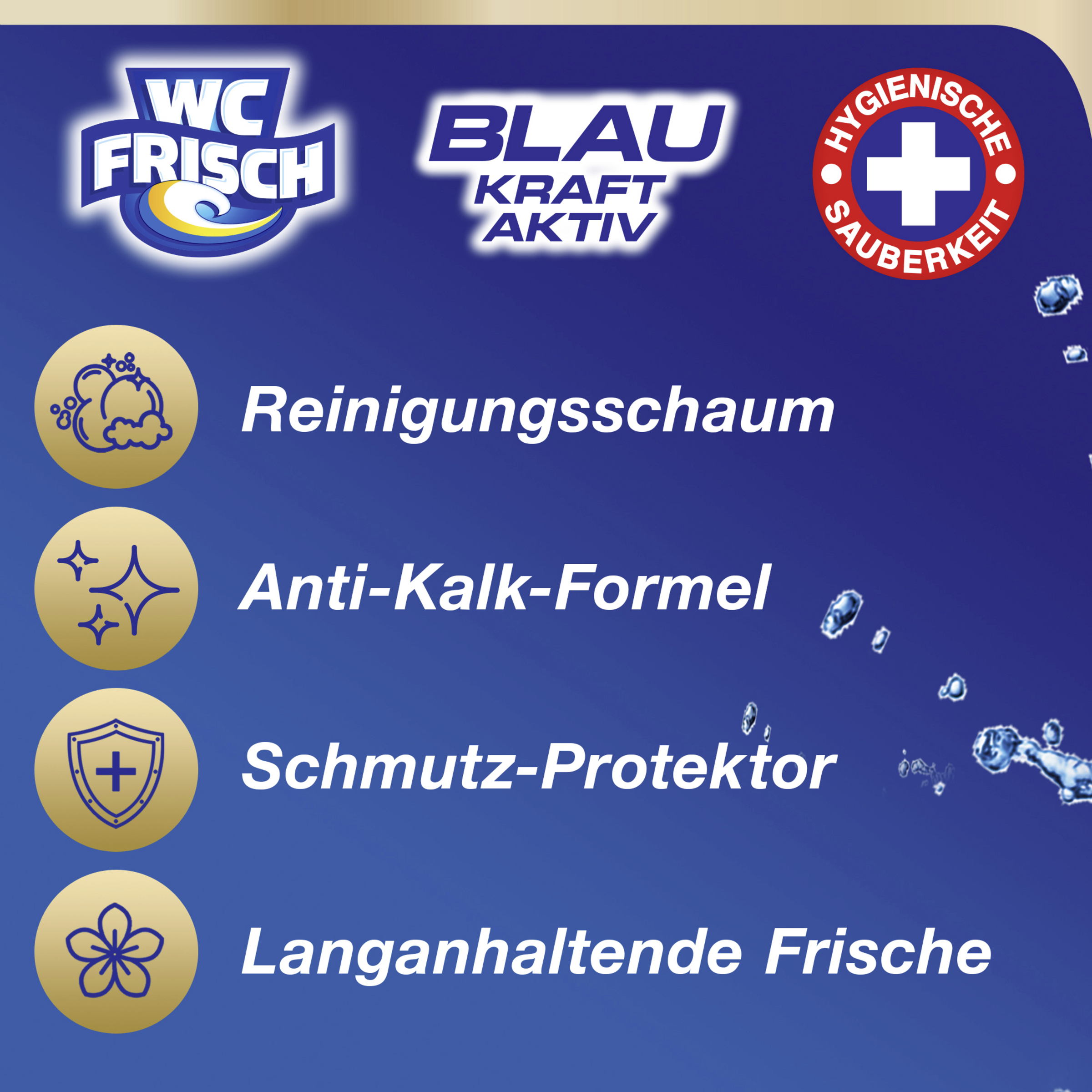 Med den innovative 4-dobbelte kombination af aktive ingredienser fra WC FRISCH beskytter WC FRISCH mod kalkaflejringer og afgiver rengøringsskum, beskyttelse mod snavs og ekstra friskhed til dit toilet. Med sit diskrete design og sine flotte farver passer vores WC FRISCH perfekt under toilettets kant.