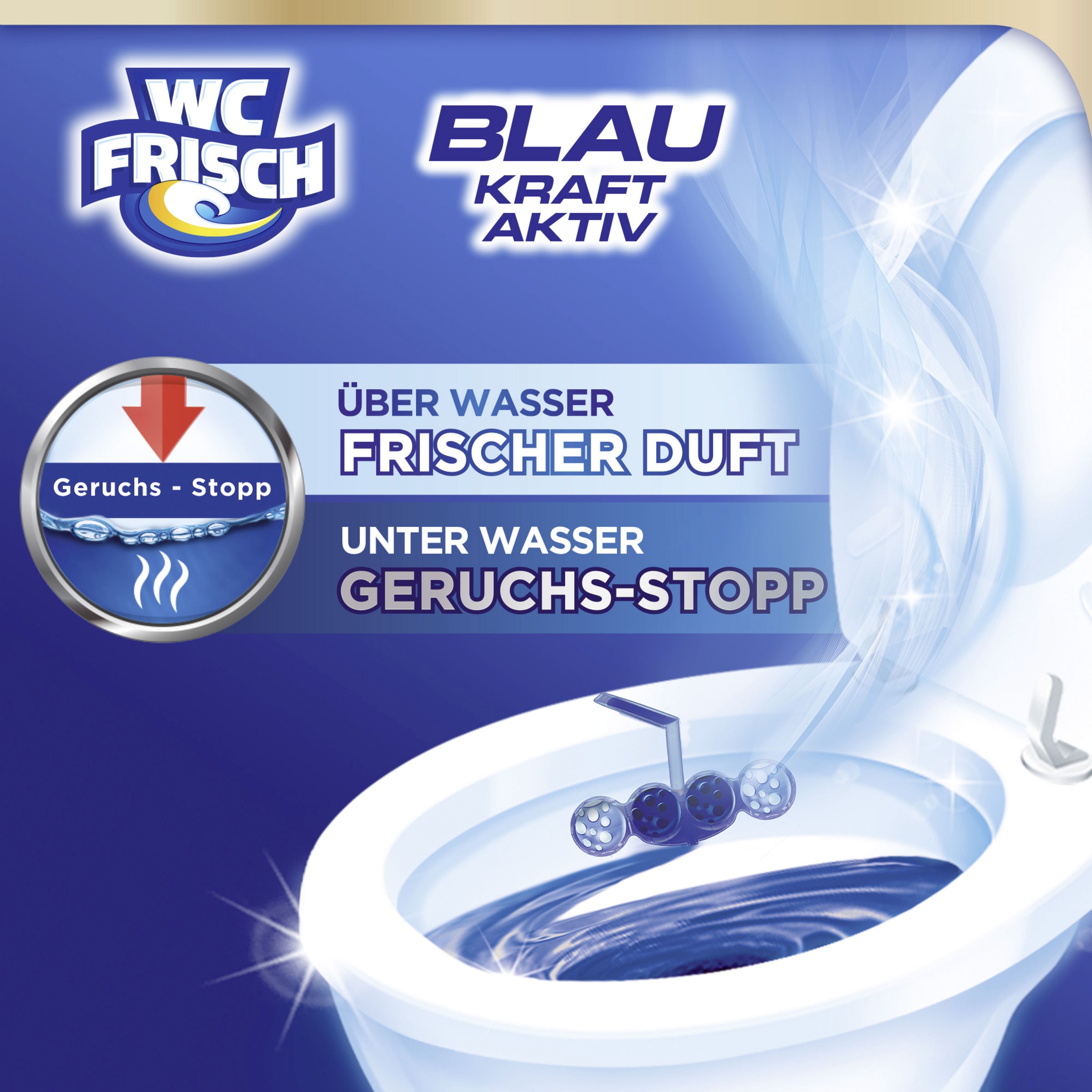 WC FRISCH Blue Power Active Chlorine sørger for en synlig rengøring med blåt vand og +50 % glans.