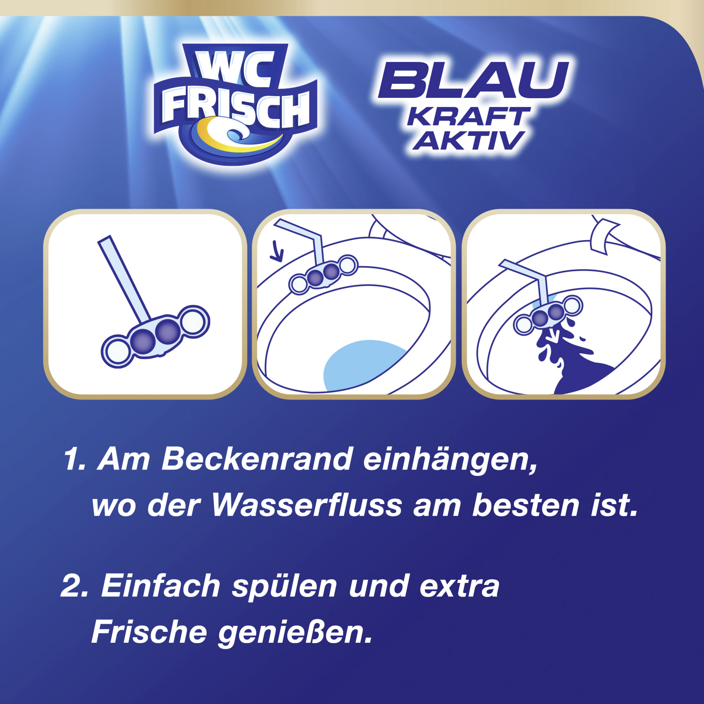 Ville det ikke være vidunderligt, hvis dit toilet altid var rent og frisk som en blå lagune? Takket være de blå vandkugler bevarer WC FRISCH Blue Power Active Rinse Aid synligt dit toilets renhed og friskhed, selv mellem skylningerne. Men hvordan? Når du skyller, opsamler kurven med Blue Power Active Rinse Aid vandet, tilsætter aktive ingredienser og frigiver det i slutningen af skylningen. Beviset herpå er det blåtfarvede vand, der bliver tilbage i dit toilet: For den bedste renhed og friskhed selv mellem skylningerne!