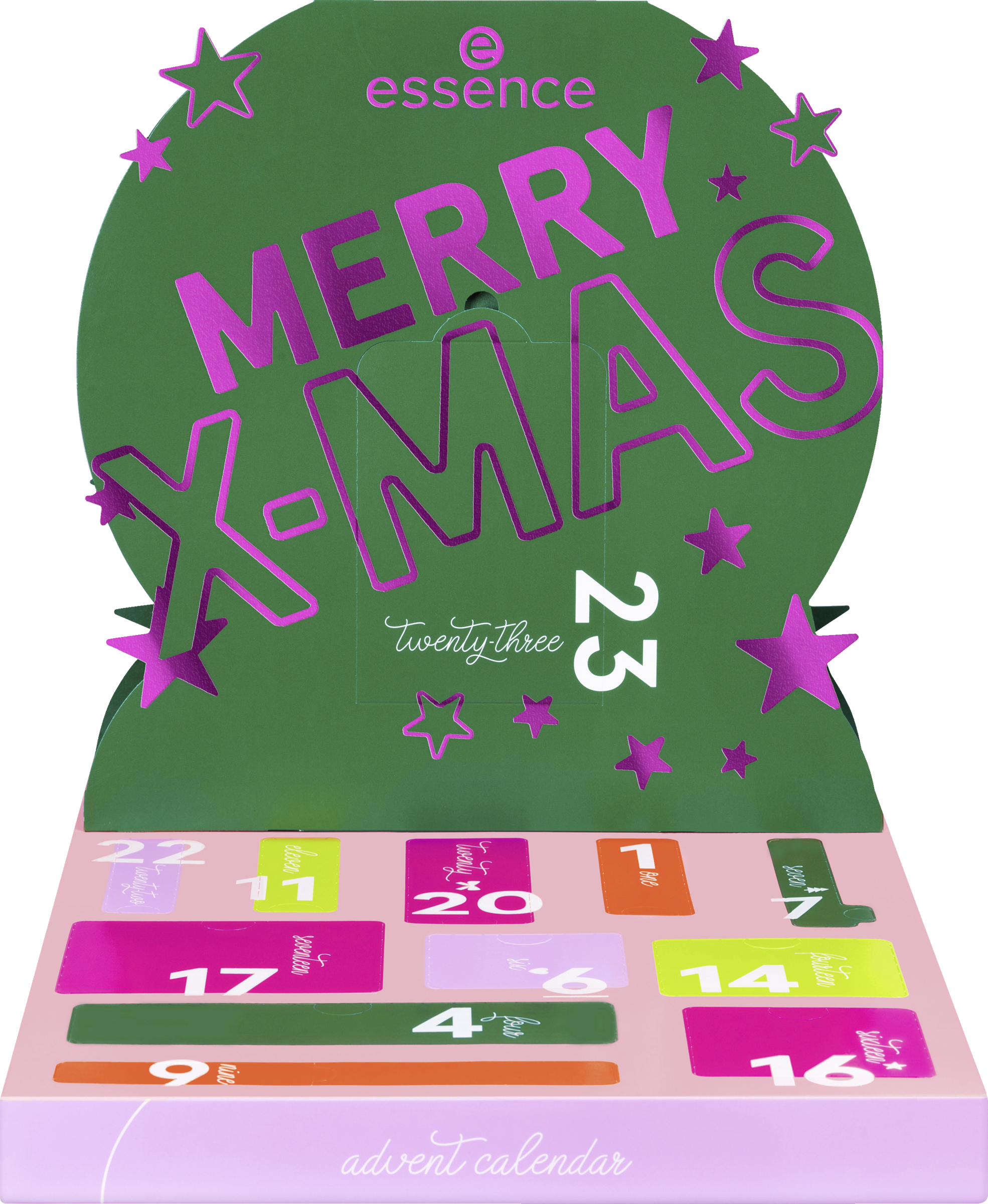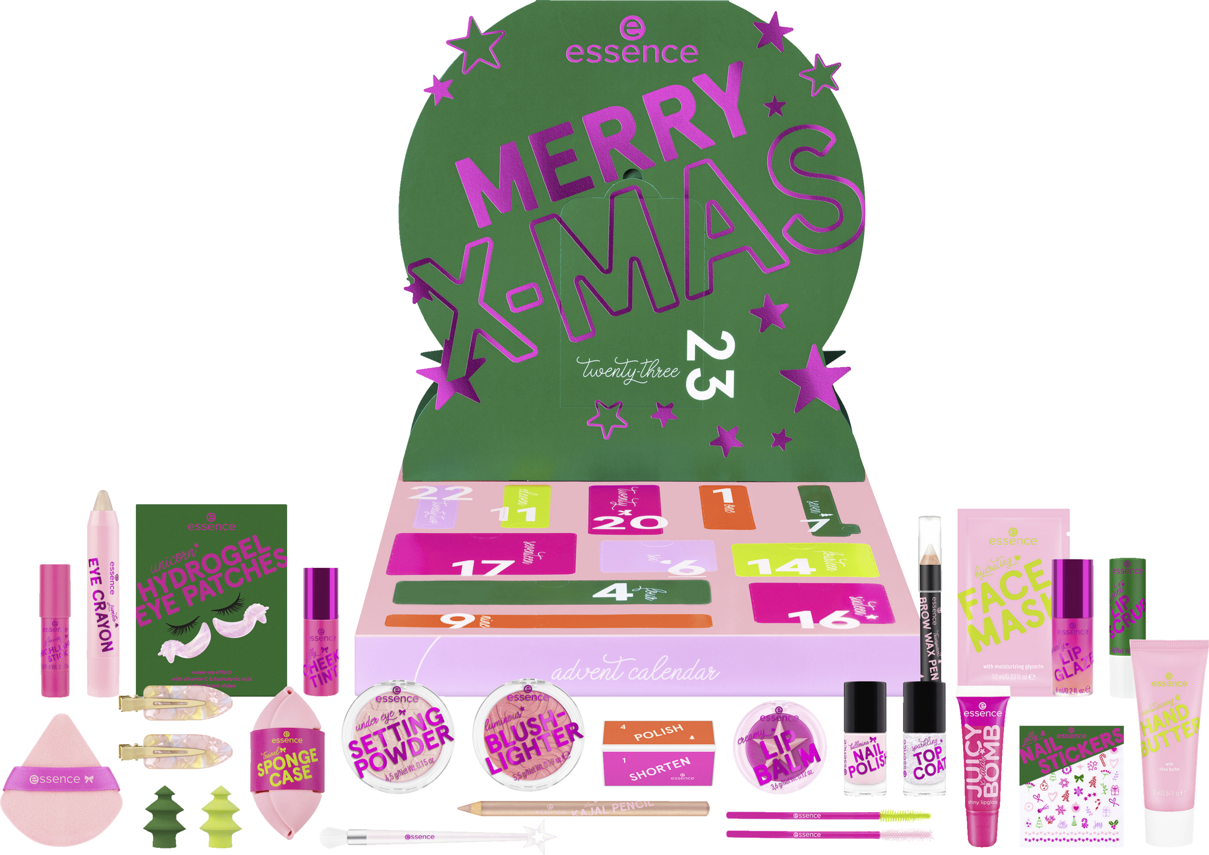 Rockin' around the X-mas tree ... Du skal blot åbne en låge i den lille X-MAS WONDER adventskalender hver dag for at få et muntert julelook. Bag hver af dem gemmer der sig et af 24 eksklusive produkter i begrænset oplag. Fra magiske makeup-overraskelser til kinder, øjne og læber til negleprodukter og praktiske redskaber - alt er perfekt afstemt til at få dit festlige look til at stråle. Den kærligt designede kollektion i et farverigt juledesign udstråler godt humør og julemagi. Uanset om det er en gave til dig selv eller til en yndlingsperson - denne adventskalender er fuld af glæde, glitter og festlige overraskelser.