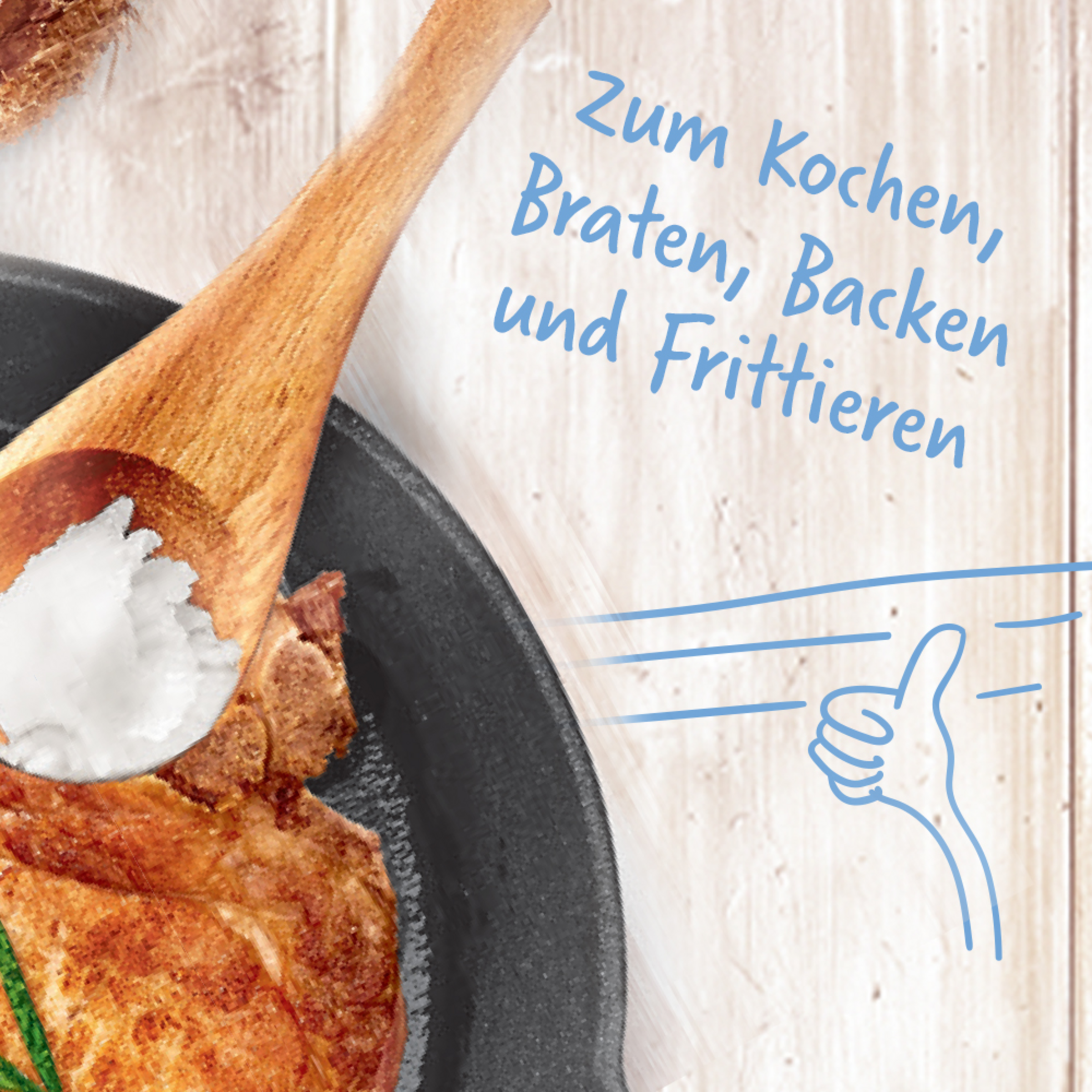 Kokosolie er fast ved Stuetemperatur og bliver flydende ved opvarmning. Opvarm ikke til over røgpunktet.