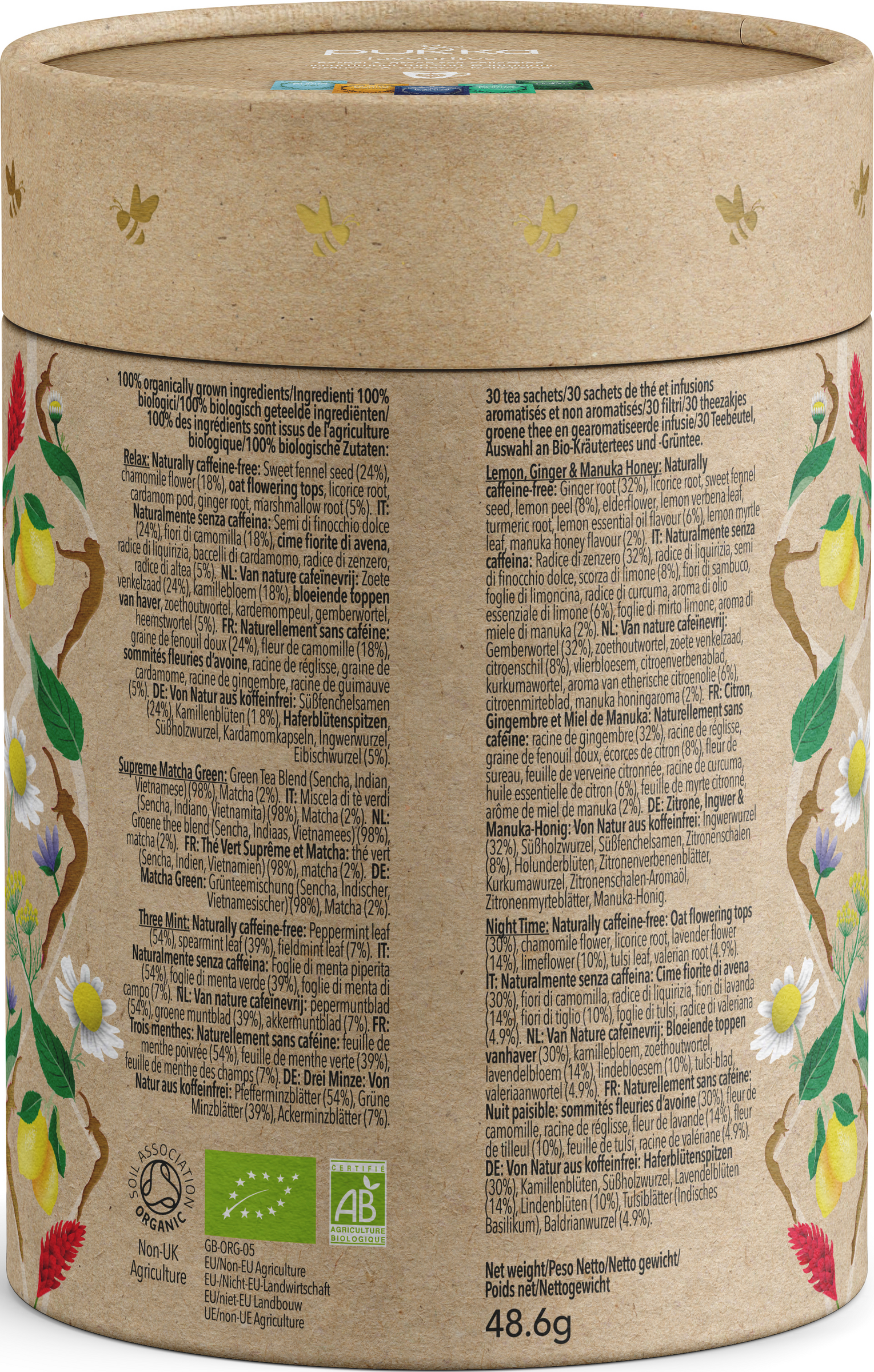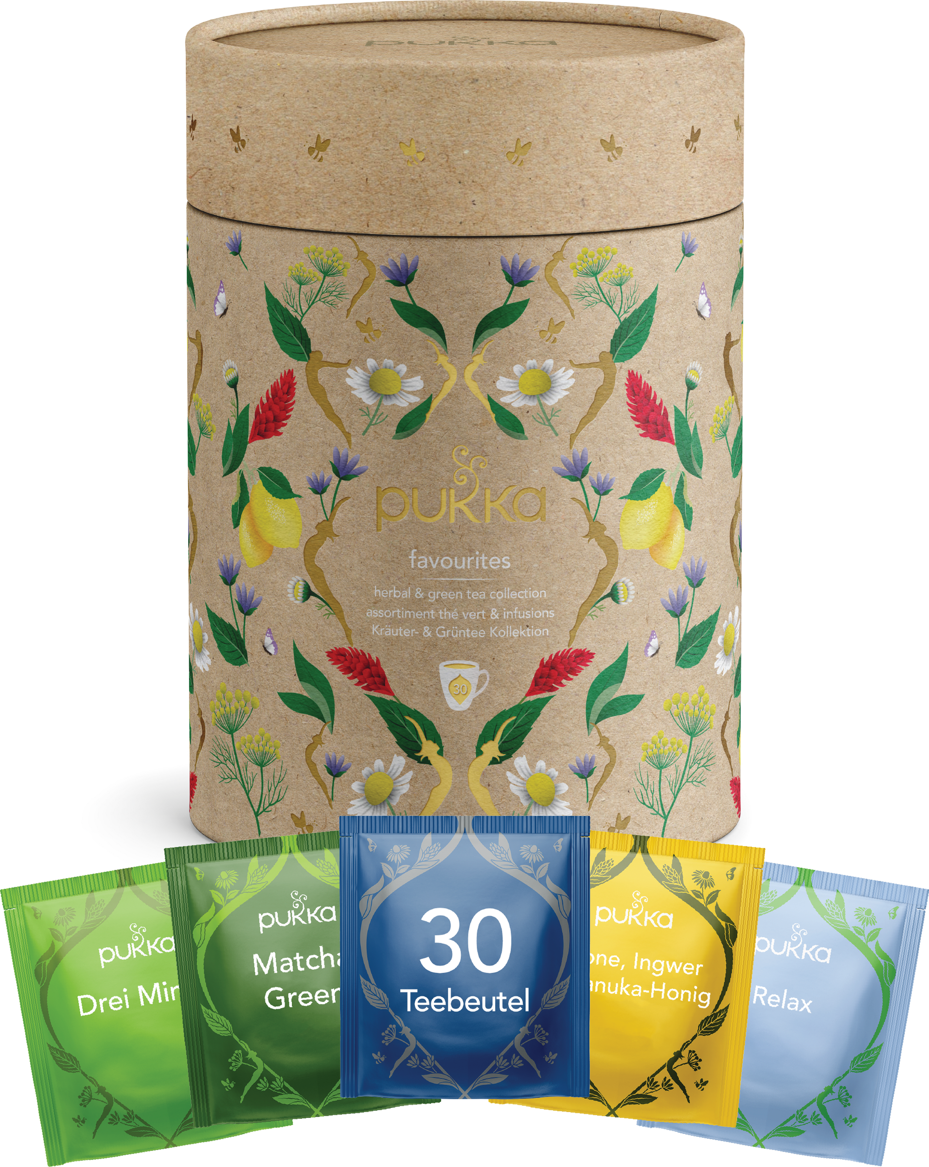 Oplev Pukkas foretrukne tedåse. Et smukt designet udvalg af de mest populære teer. Med 30 teposer i 5 lækre smagsvarianter kan du nyde duftene og den lækre smag af økologiske urteteer, der udelukkende er fremstillet af økologiske urter af højeste kvalitet og udvundet på ansvarlig vis. Oplev den brændende friske kombination af "citron, ingefær og manuka-honning", som varmer indefra og holder kulden på afstand. Nyd de søde blomsternoter i "Night Time" og friskheden i "Three Mints", en blanding af pebermynte, spearmint og markmynte. Oplev følelsen af "Matcha Green", en lækker blanding af grøn te og matchapulver. Eller berolig dine sanser med den blide duft af "Relax", en blanding af kamille, fennikel og marshmallowrod.