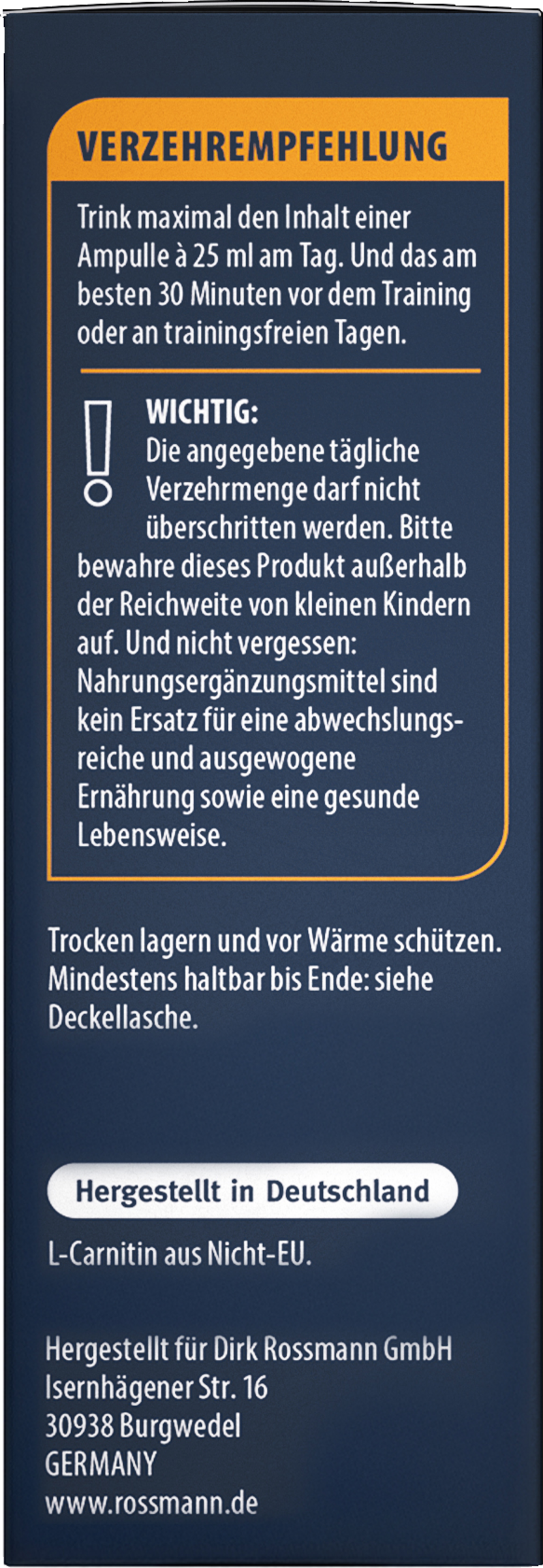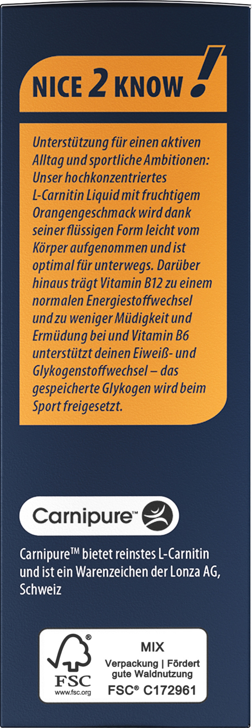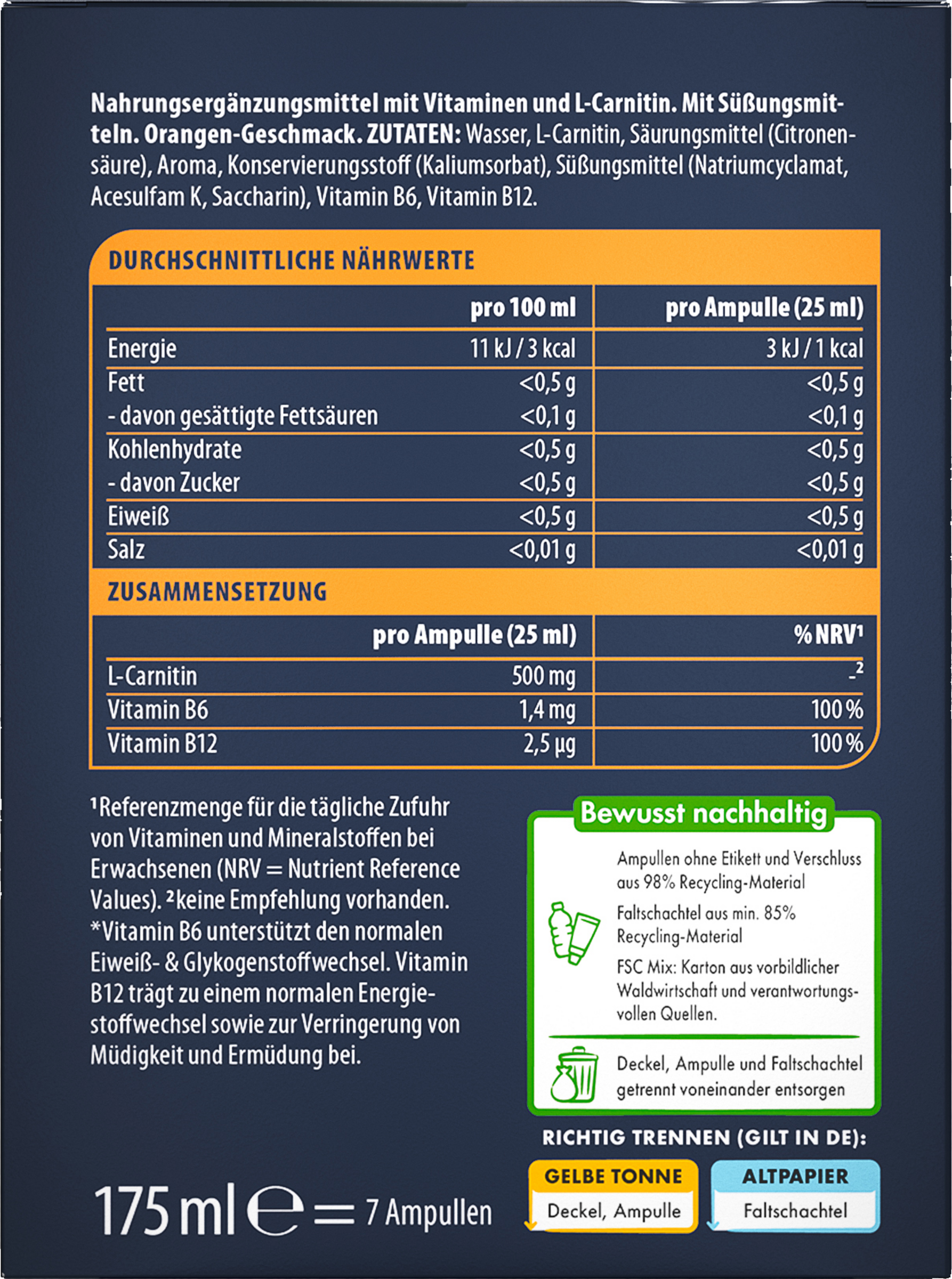 Støtte til et aktivt hverdagsliv og sportslige ambitioner: Vores højkoncentrerede L-carnitin liquid med en frugtagtig appelsinsmag optages let af kroppen takket være sin flydende form og er ideel til at have med på farten. Derudover bidrager B12-vitamin til et normalt energistofskifte og mindre træthed og udmattelse, og B6-vitamin støtter dit protein- og glykogenstofskifte - det oplagrede glykogen frigives under sport.