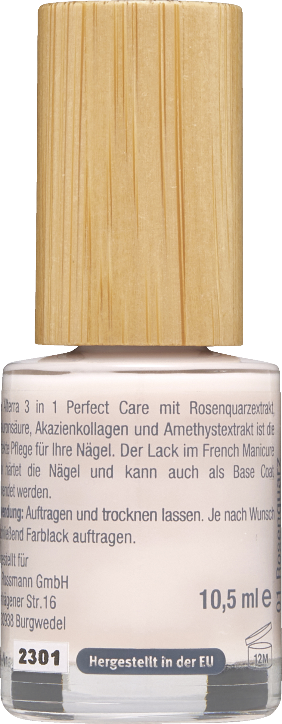 Alterra 3 in 1 Perfect Care med rosenkvartsekstrakt, Hyaluronsyre, akaciekollagen og ametystekstrakt er den perfekte Pleje til dine Negle. Den franske manicure-look-lak hærder Negle og kan også bruges som base coat. Vegansk