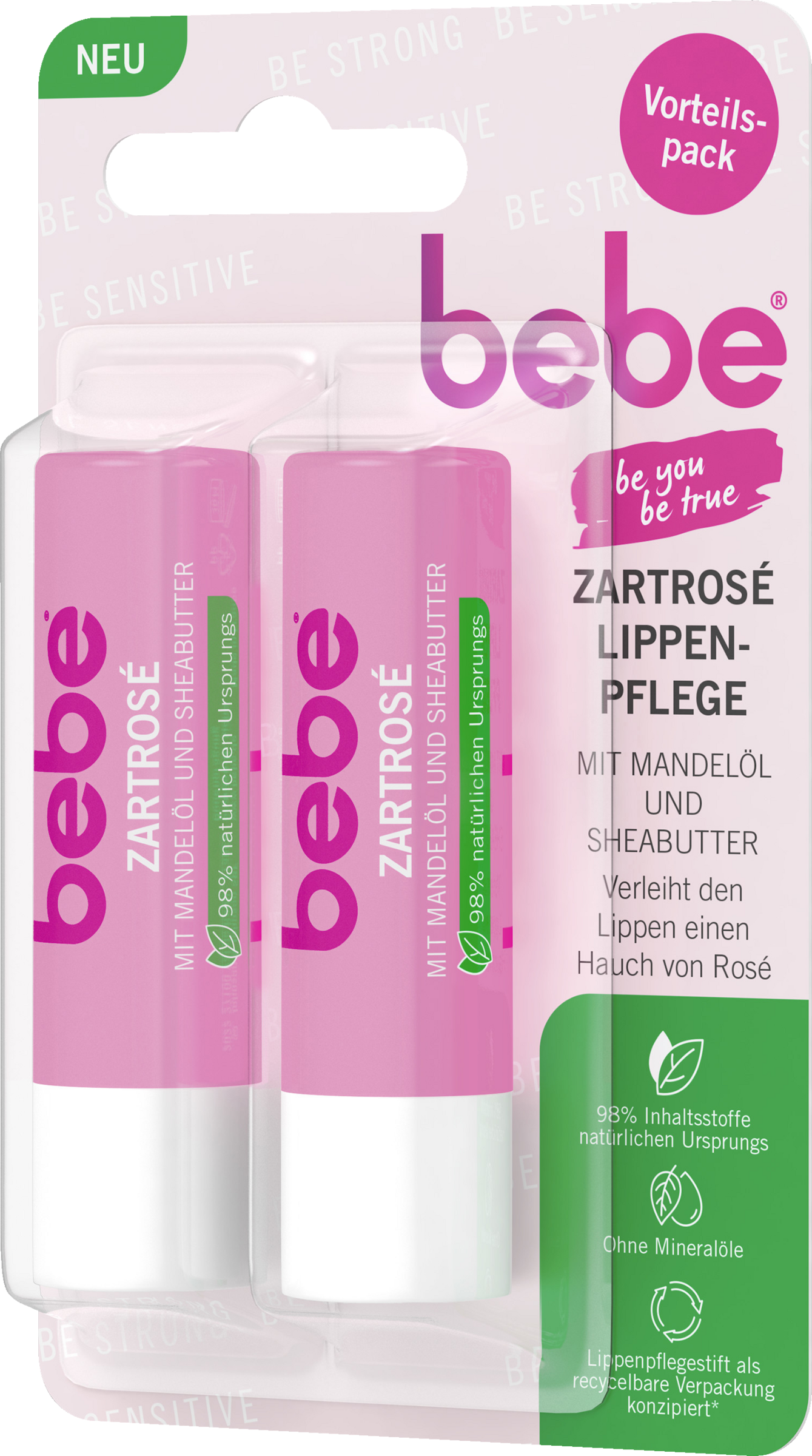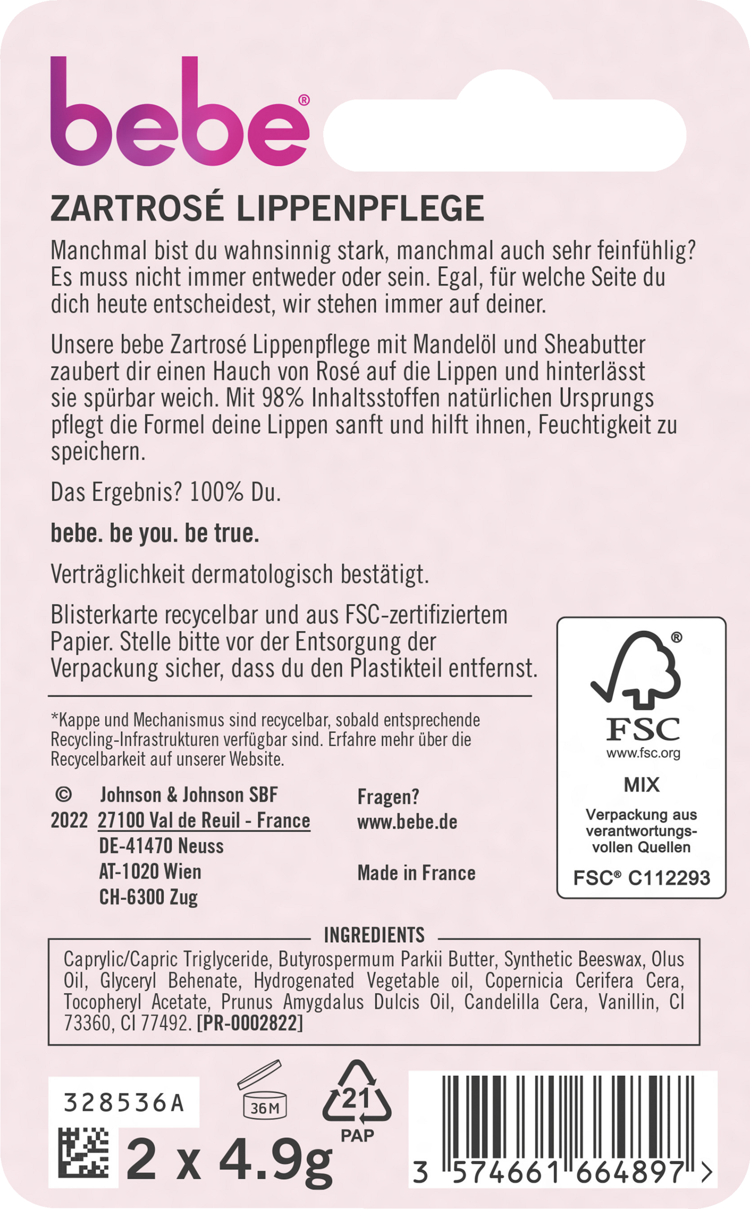 Vores bebe Zarrosé Læbepleje med Mandelolie og Sheasmør fremmaner et strejf af rosé på dine Læber og efterlader dem mærkbart bløde. Med 98% ingredienser af naturlig oprindelse nærer formlen dine Læber blidt og hjælper dem med at bevare fugten. Hudvenligheden er dermatologisk bekræftet.