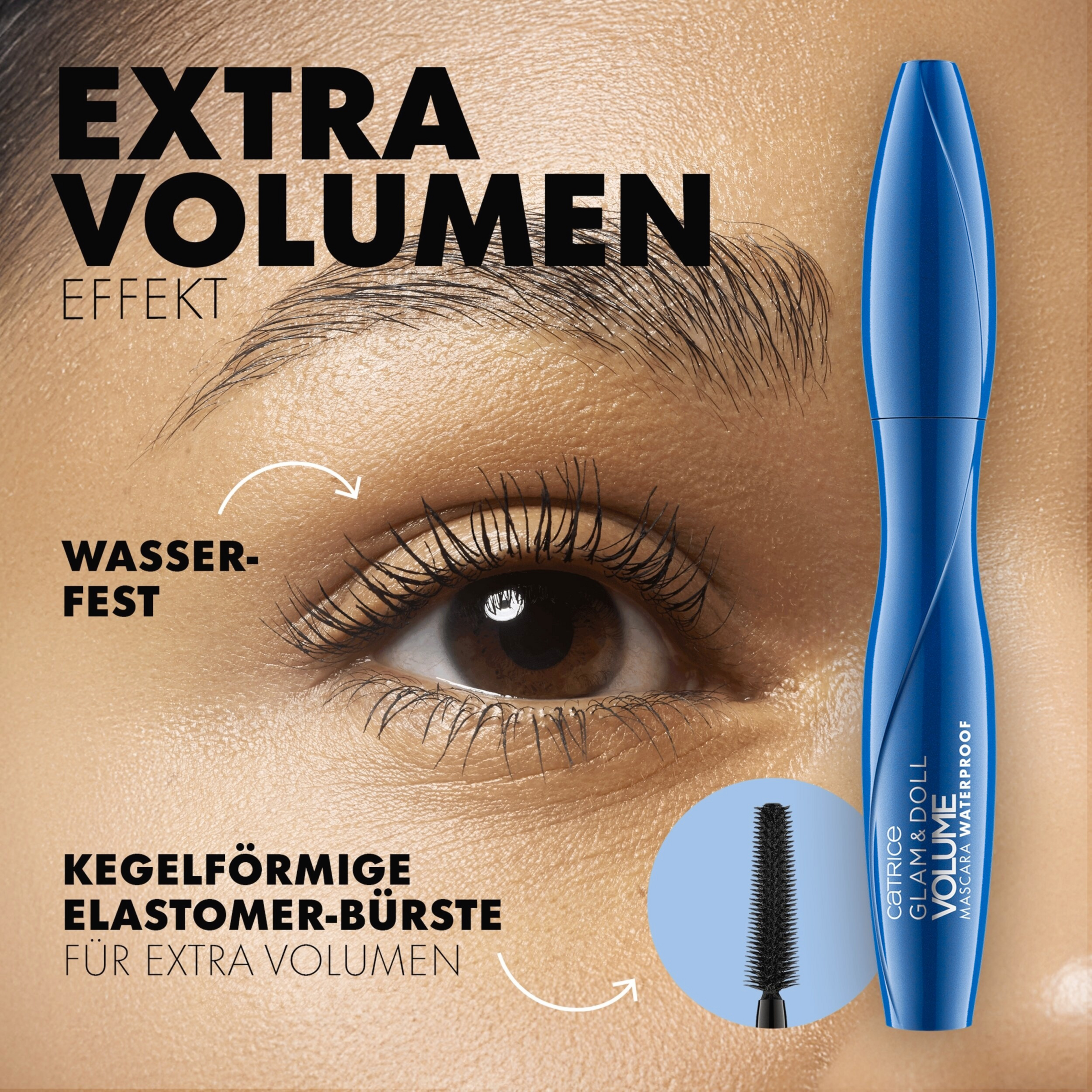 WATERPROOF DOLL EYES : Du kan få meget holdbare doll eyes med Glam & Doll Volume Mascara Waterproof. Den specielle elastomerbørste får fat på meget af det cremede sorte produkt og omslutter hver eneste vippe uden at tynge den ned. Resultatet er ekstra volumen, fascinerende længde og smukt buede vipper – hele dagen! Testet af øjenlæger.