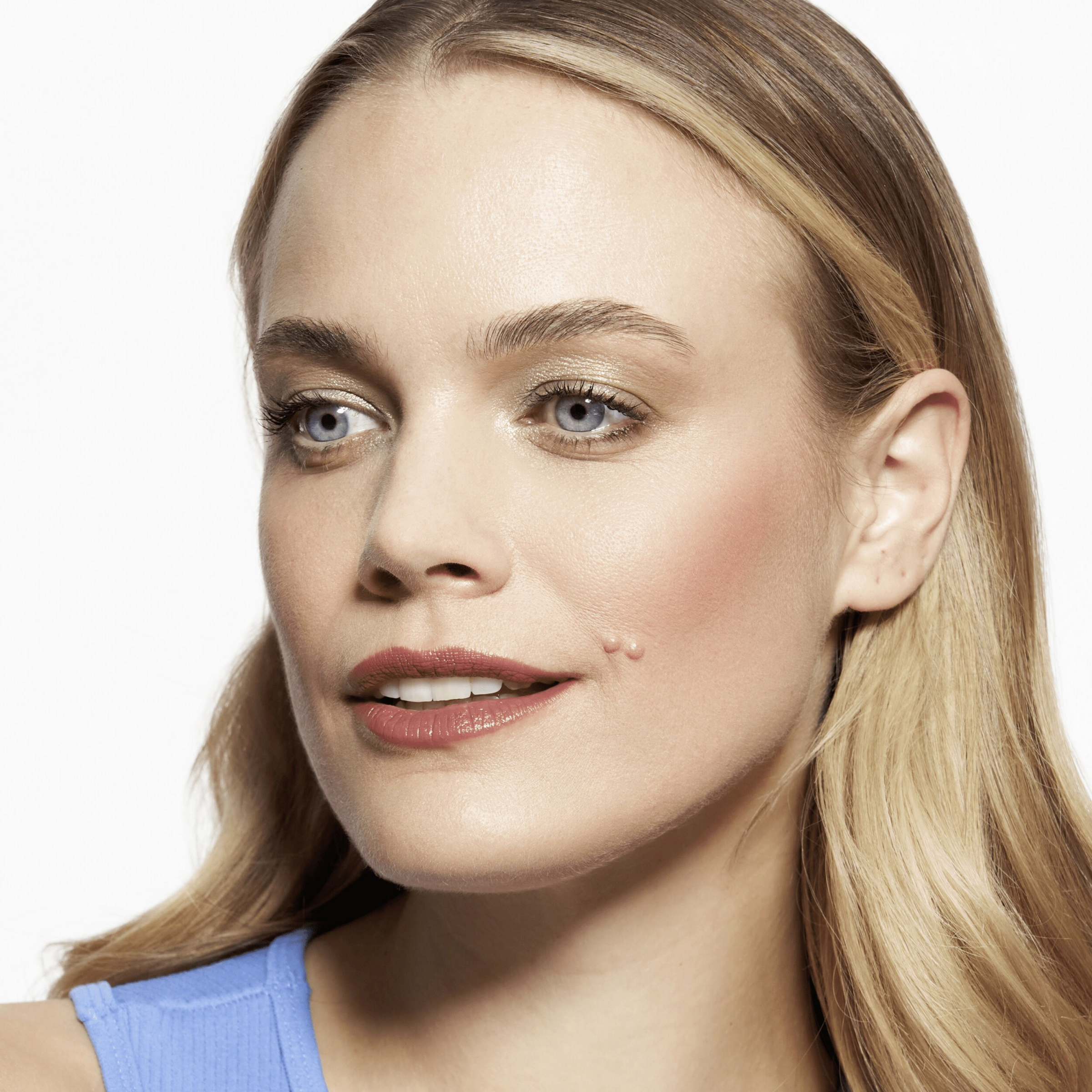 Påfør den brune Læbestift først på den ene halvdel og derefter på den anden halvdel. Den kan påføres på underlæben på én gang. Lad det tørre kort og dit look er færdigt.