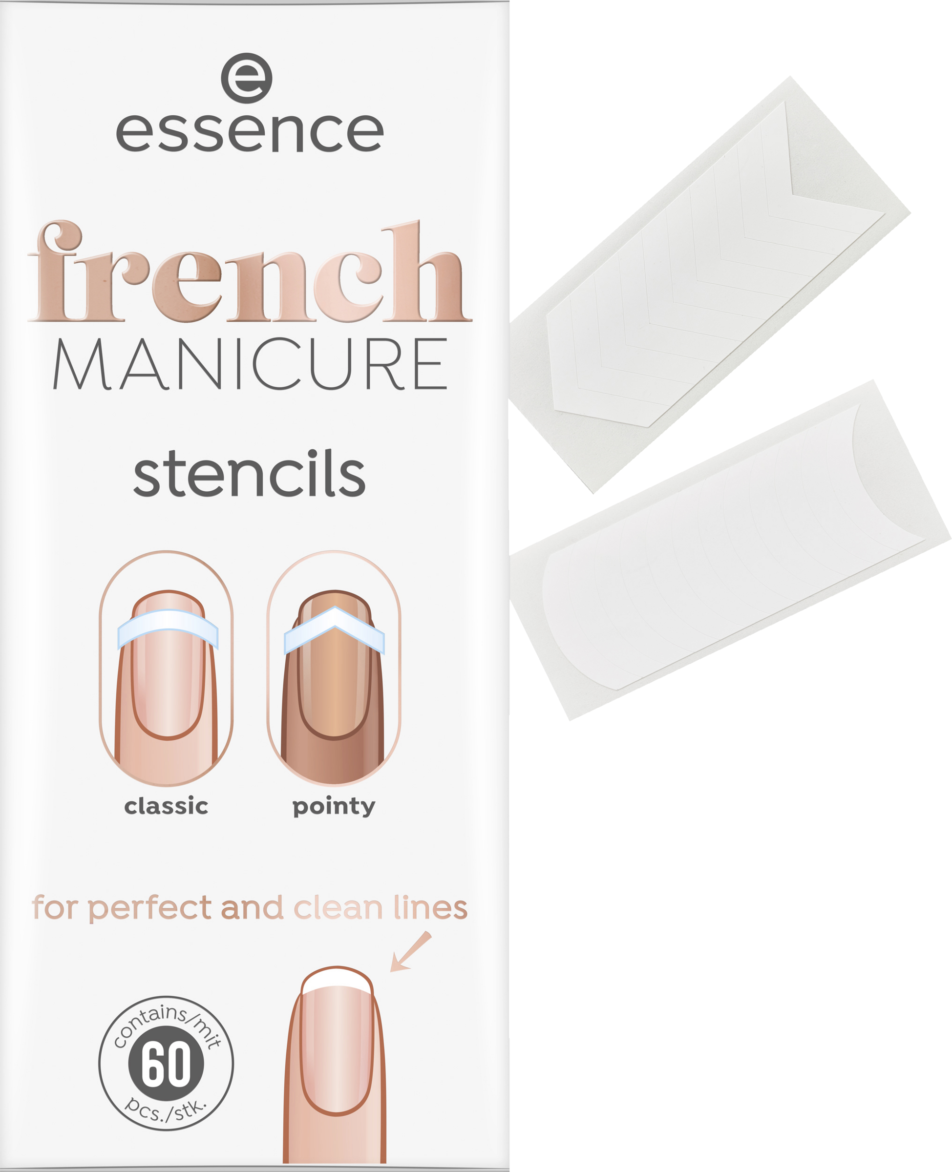 Med essence fransk manicure stencils kan franske negle opnås på ingen tid: Halvmåneformede og tilspidsede stencils er perfekte til præcist stylede neglespidser. Stencilerne sikrer perfekte og rene linjer for at skabe kreative looks.