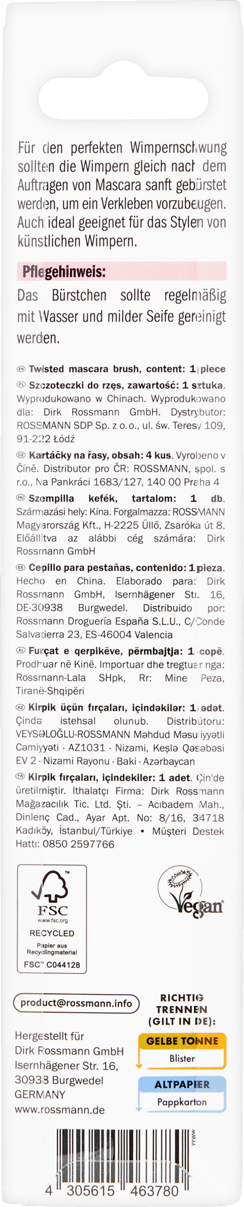 Med den fine spiralbørste kan øjenvipper, der er klistret til af mascara, adskilles optimalt. For at få perfekte vipper skal øjenvipperne børstes forsigtigt umiddelbart efter påføring af mascara. Også ideel til styling af kunstige øjenvipper.