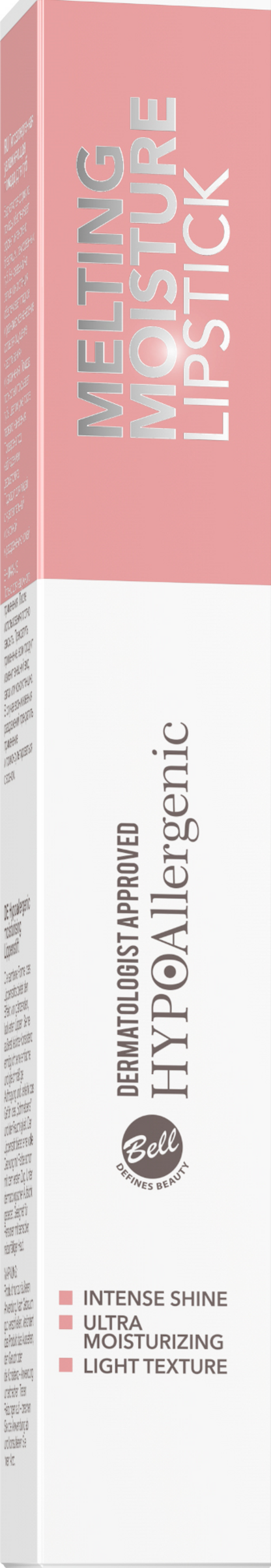 Den fint smeltende formel i Melting Moisture Lipsticks fra HYPOAllergenic giver læberne en masse fugt og sørger samtidig for intensiv farvedækning, allerede ved første påføring. Læberne får en let skinnende finish. Den lette konsistens gør den nem og jævn at påføre. Produktet er testet under opsyn af hudspecialister. Egnet til personer med følsom hud med tendens til allergi.