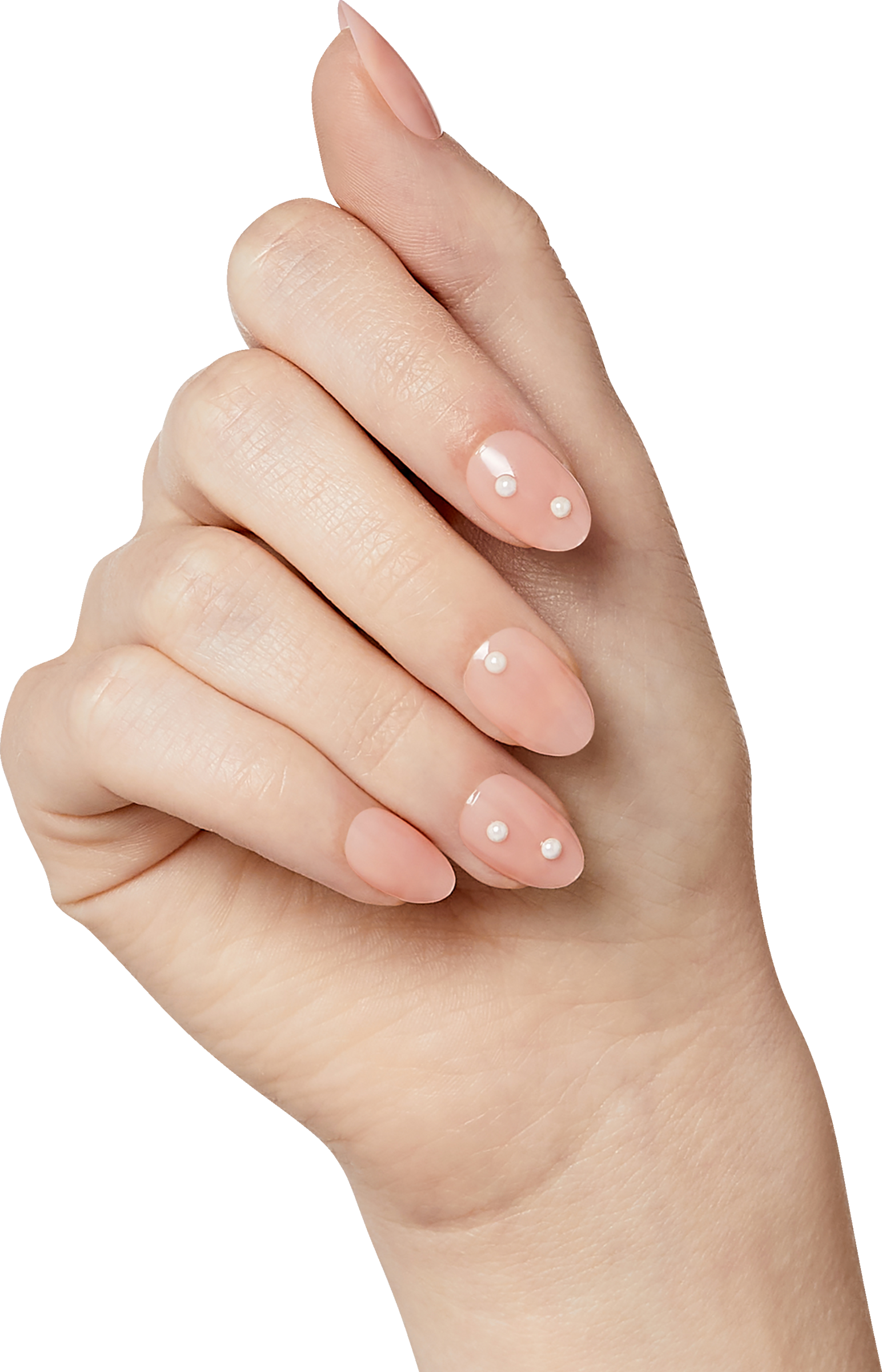 - korte mandelformede fashion-negle er nude med diskrete juveler