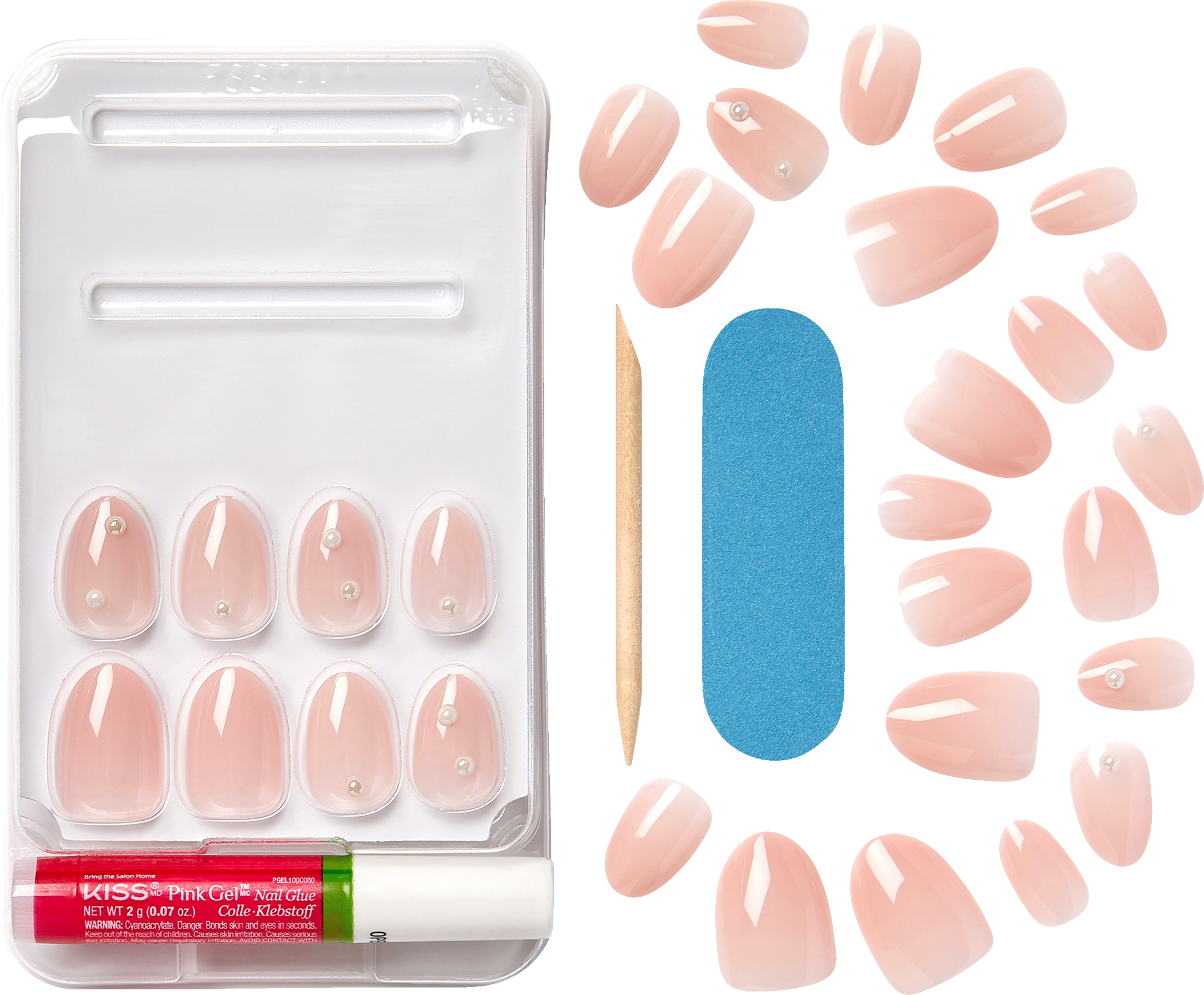 - 30 kunstige negle, 1 negleklæber pink 2g, 1 mini fil, 1 manicurepind