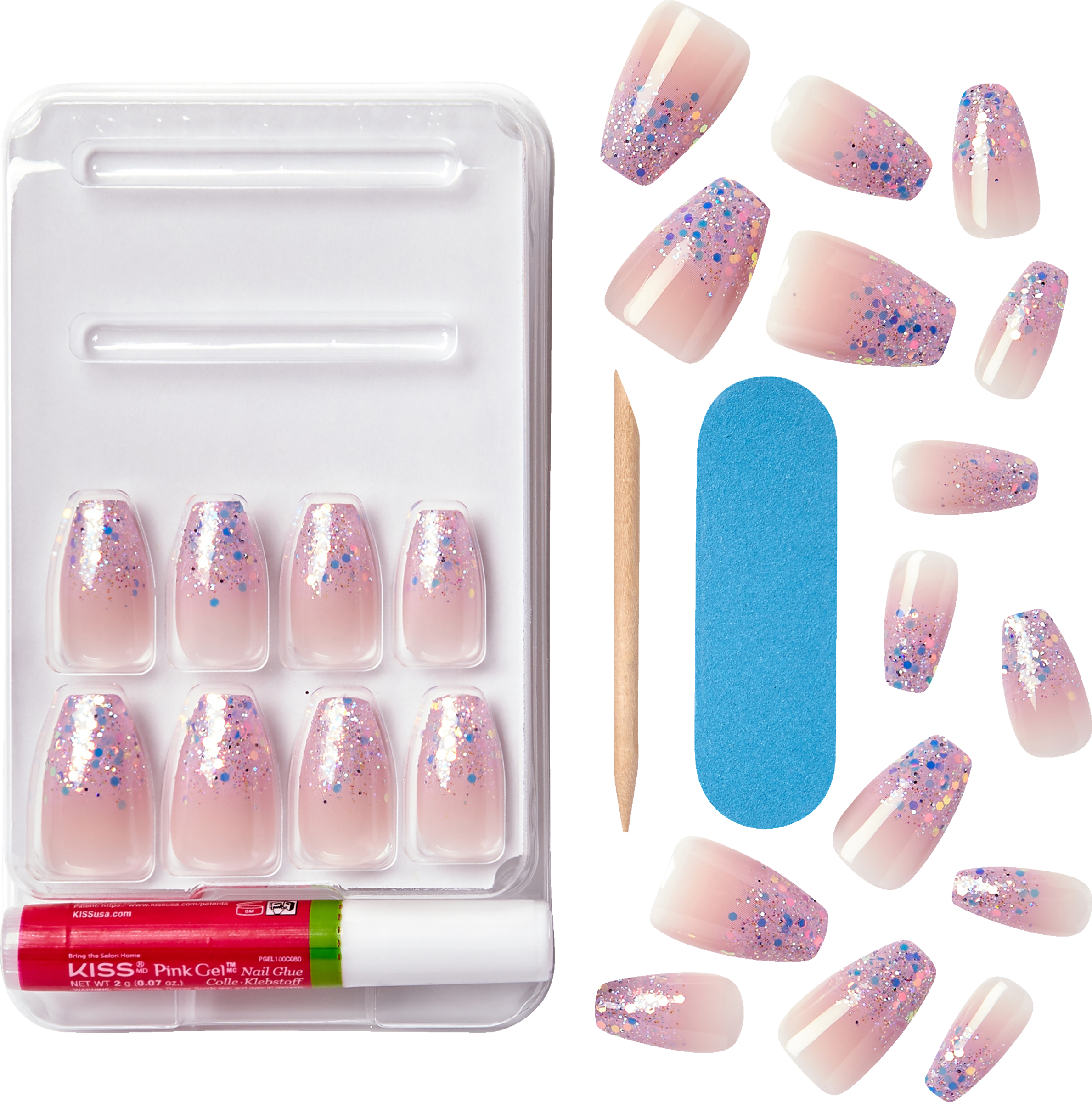 - 24 kunstige negle, 1 negleklæber pink 2g, 1 mini fil, 1 manicurepind