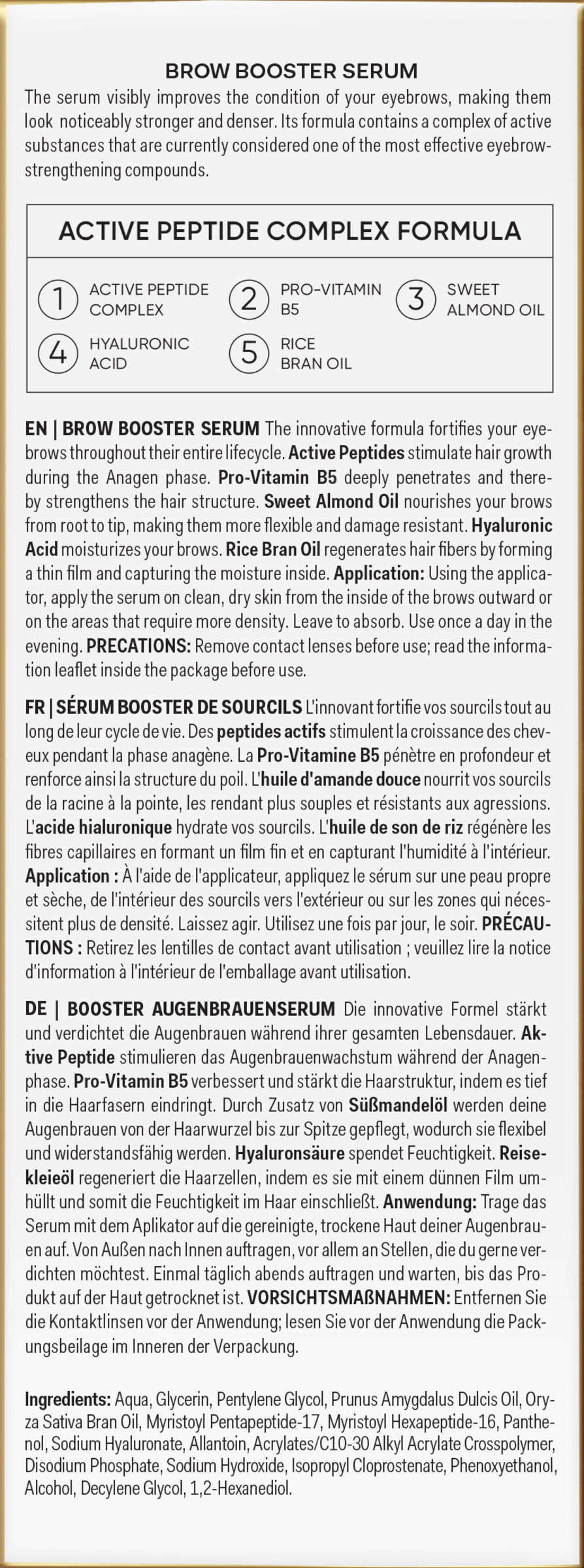 Den innovativ formel styrker og fortykker Øjenbryn gennem hele deres Levetid. Aktive peptider plejer Øjenbryn og giver fugt. Pro-Vitamin B5 forbedrer og styrker hårets struktur ved at trænge dybt ind i hårfibrene. Ved at tilføje sød mandelolie plejes dine Øjenbryn fra Hårrod til spids, hvilket gør dem fleksible og modstandsdygtige. Hyaluronsyre stimulerer øjenbrynsvækst i den anagene fase. Risklidolie regenererer hårcellerne ved at dække dem med en tynd hinde og dermed låse fugten ind i håret.