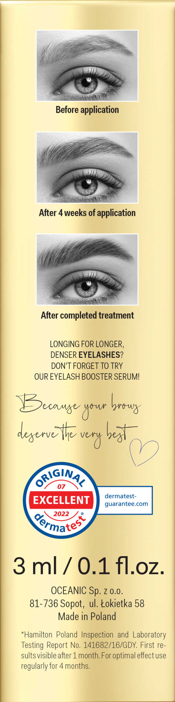 Påfør serummet med applikatoren på ren, tør hud på dine Øjenbryn . Påfør udefra og ind, især på områder, som du gerne vil komprimere. Påfør én gang dagligt om aftenen og vent til produktet tørrer på huden. Serummet kan også bruges på permanent Øjne -up, på henna Øjenbryn eller efter endt kemoterapi.